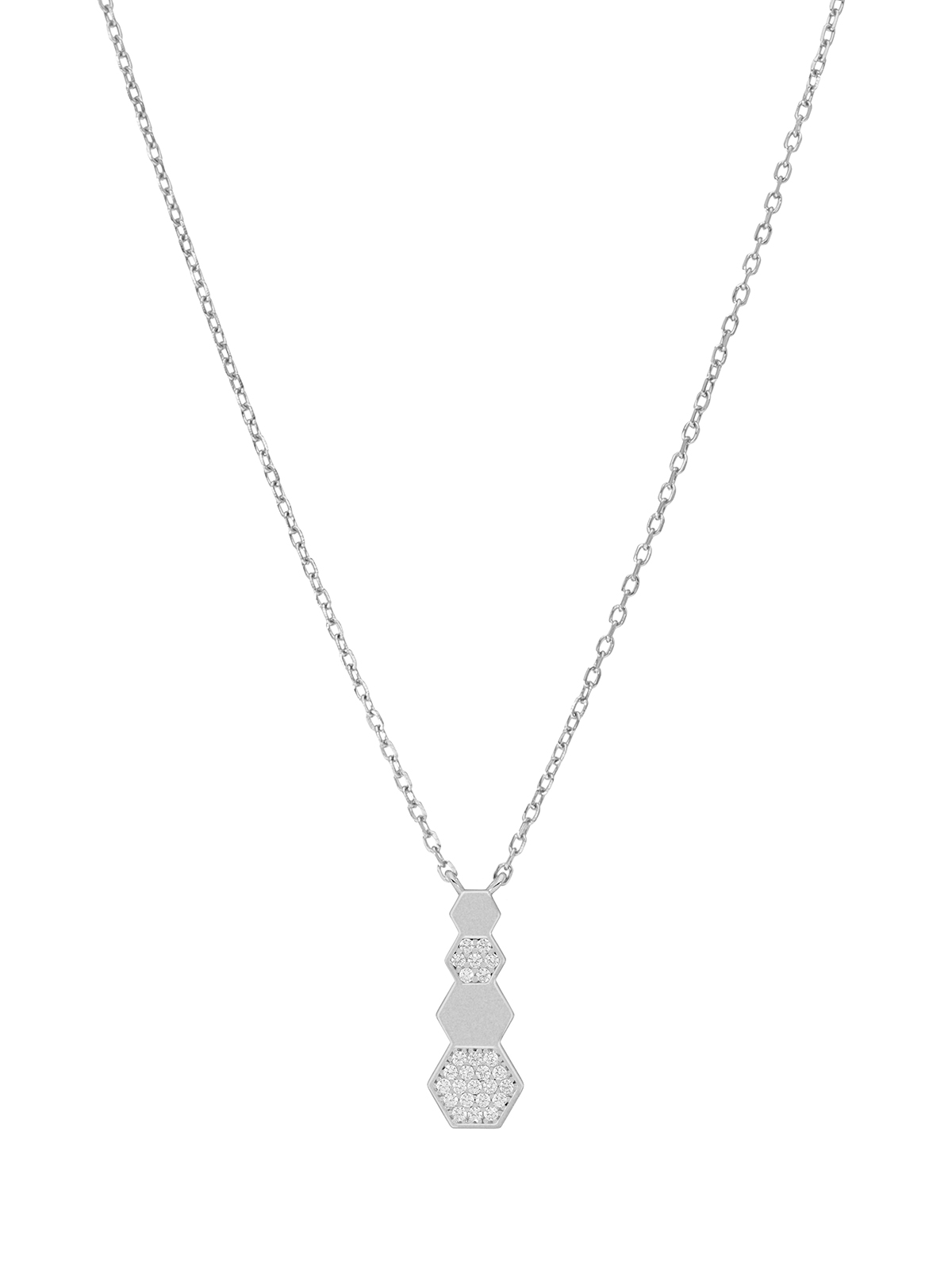 Collar hexagonal. Plata de 1ª Ley rodiada. Circonitas en microengaste. Cierre mosquetón. Cadena adaptable.