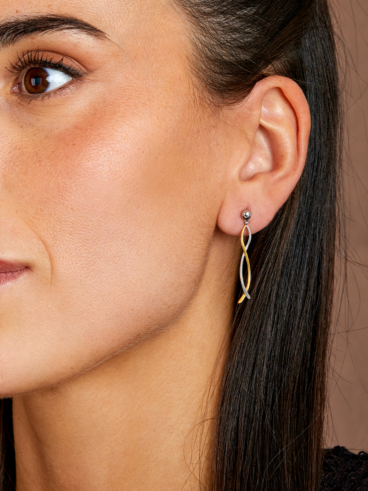 Pendientes tirabuzón entrelazado. Plata de 1ª Ley rodiada. Cierre presión.