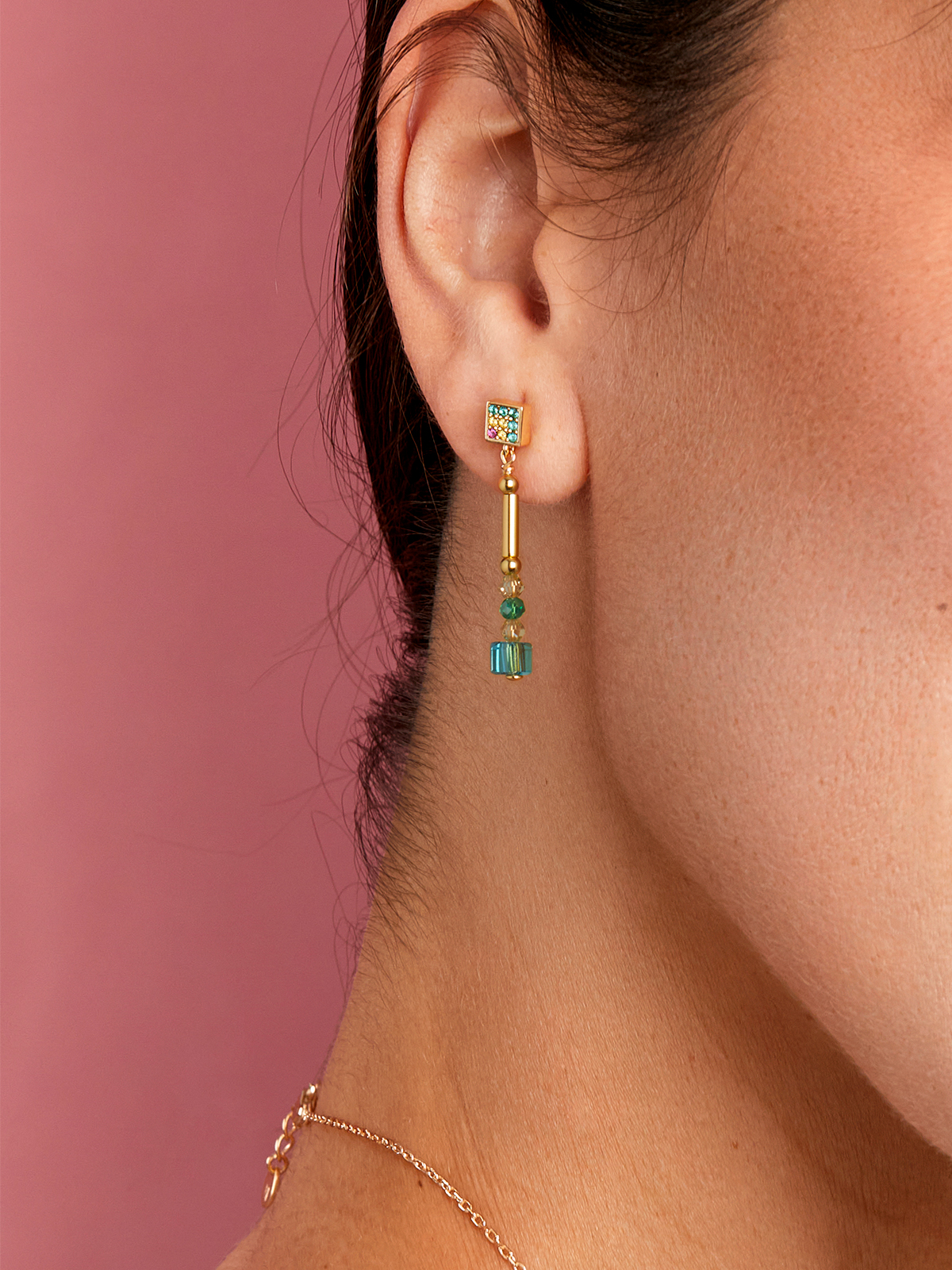 Pendientes circonitas combinado con cristales. Plata de 1ª Ley baño en oro de 18k. Circonitas en microengaste. Circonitas y cristales color: apple green, aguamarina y ruby. Cierre presión.