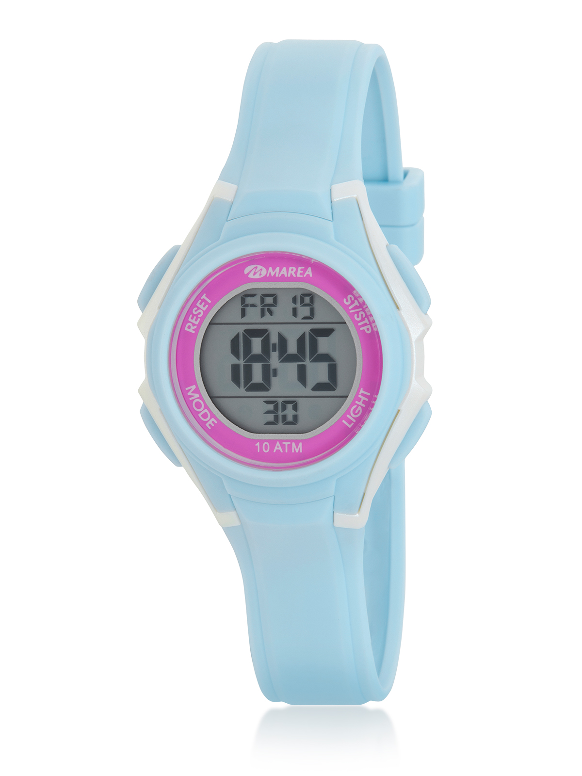 Material Brazalete: Caucho color azul claro con hebilla de acero.