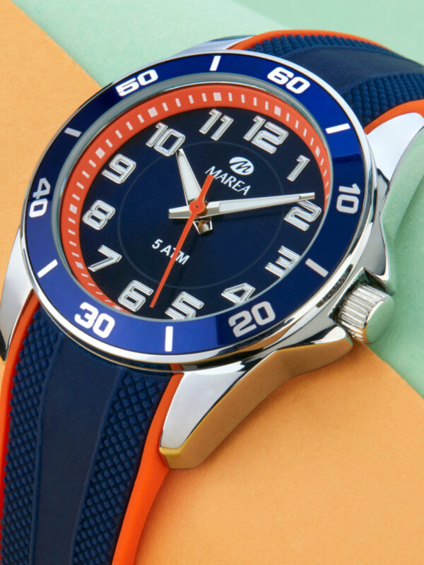 Movimiento japonés: 3 agujas. Diámetro Caja: 33 mm. Material Caja: Plástico. Material Brazalete: Caucho color azul oscuro, laterales naranjas y con hebilla de acero. Resistente al agua: 10 ATM