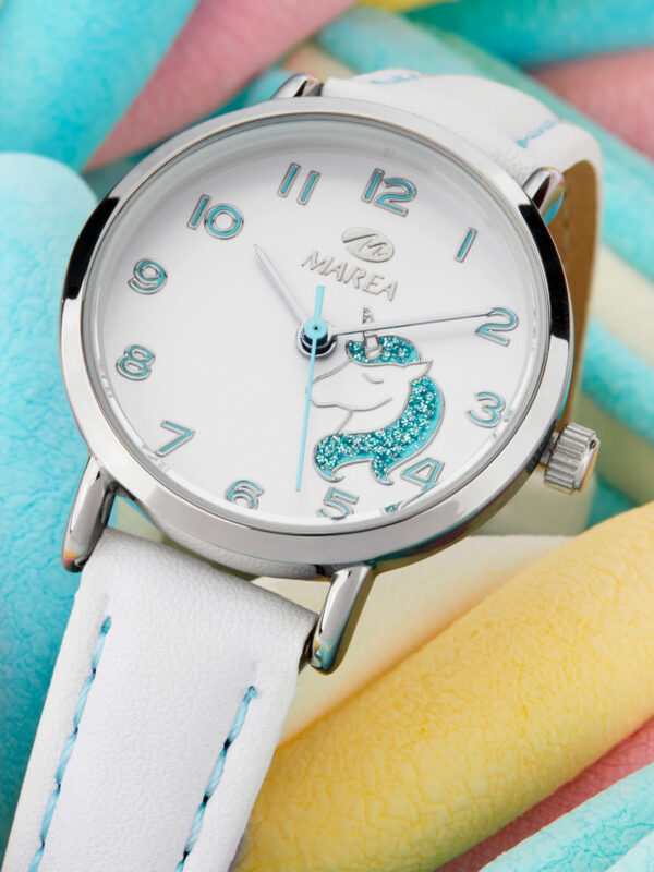 Esfera: Color blanco con motivo de unicornio e índices en color turquesa.