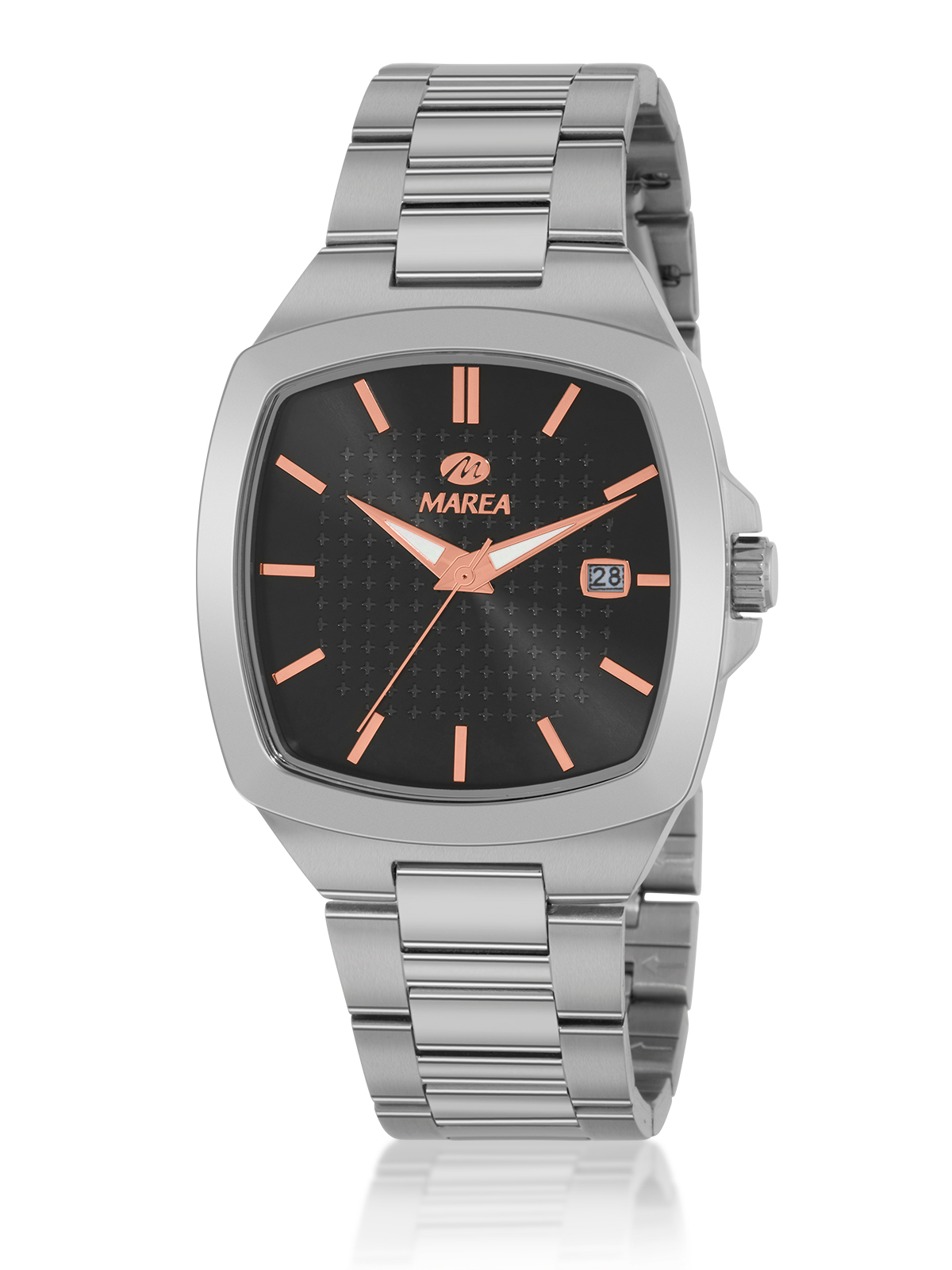 Reloj con movimiento japonés: 3 agujas. Esfera cuadrada de color negro con índices y agujas rose gold. Acabado plateado. Diámetro Caja: 38x47mm. Material Caja: Acero/Steel. Material Brazalete: Acero/Steel. Resistente al agua: 5 ATM