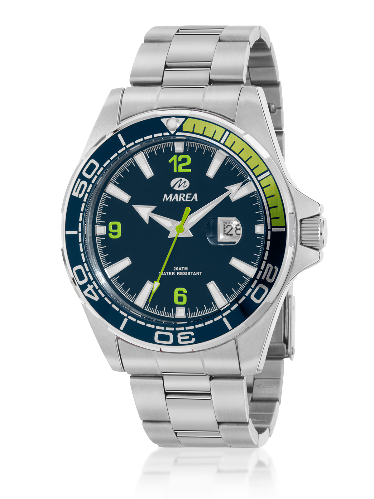 Reloj con movimiento japonés: 3 agujas. Esfera de color azul marino con detalles en verde. Acabado plateado. Diámetro Caja: 42mm. Material Caja: Acero/Steel. Material Brazalete: Acero/Steel. Resistente al agua: 20 ATM.