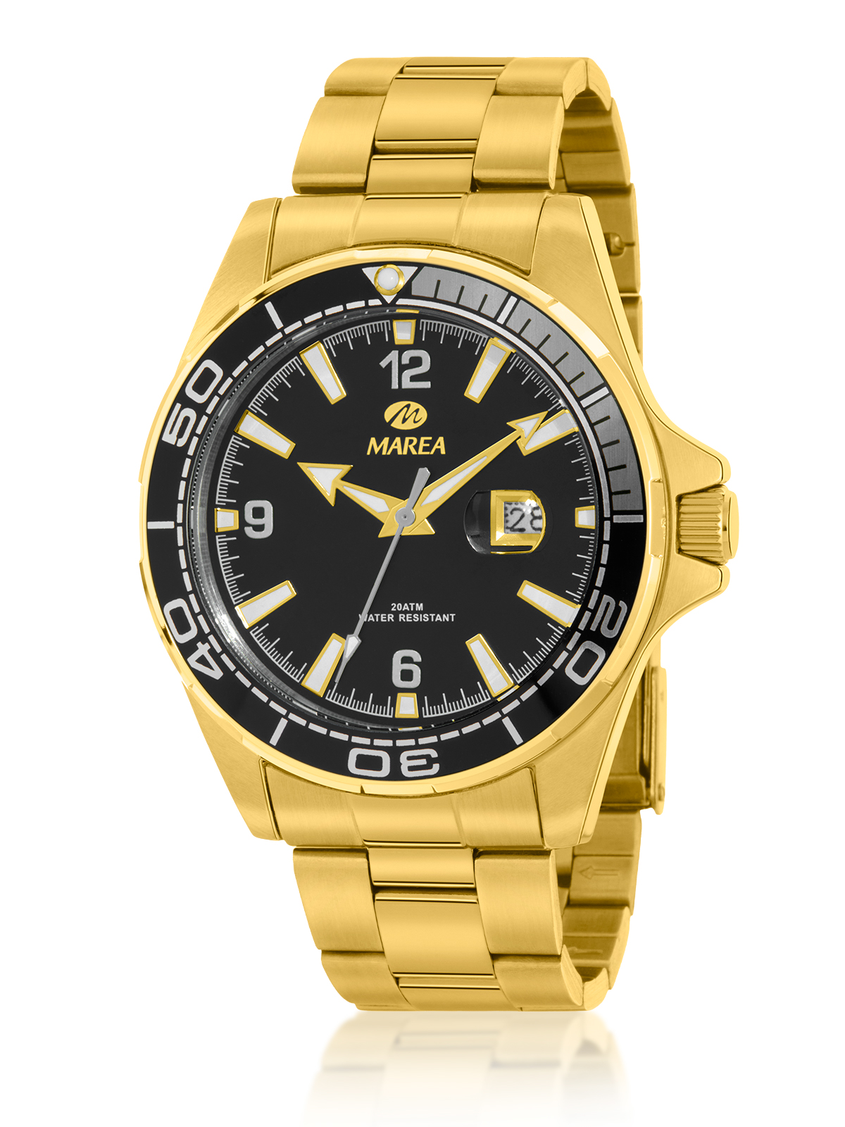 Reloj con movimiento japonés: 3 agujas. Esfera de color negro con detalles en dorado y gris. Acabado dorado. Diámetro Caja: 42mm. Material Caja: Acero/Steel. Material Brazalete: Acero/Steel. Resistente al agua: 20 ATM.