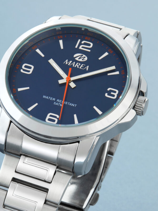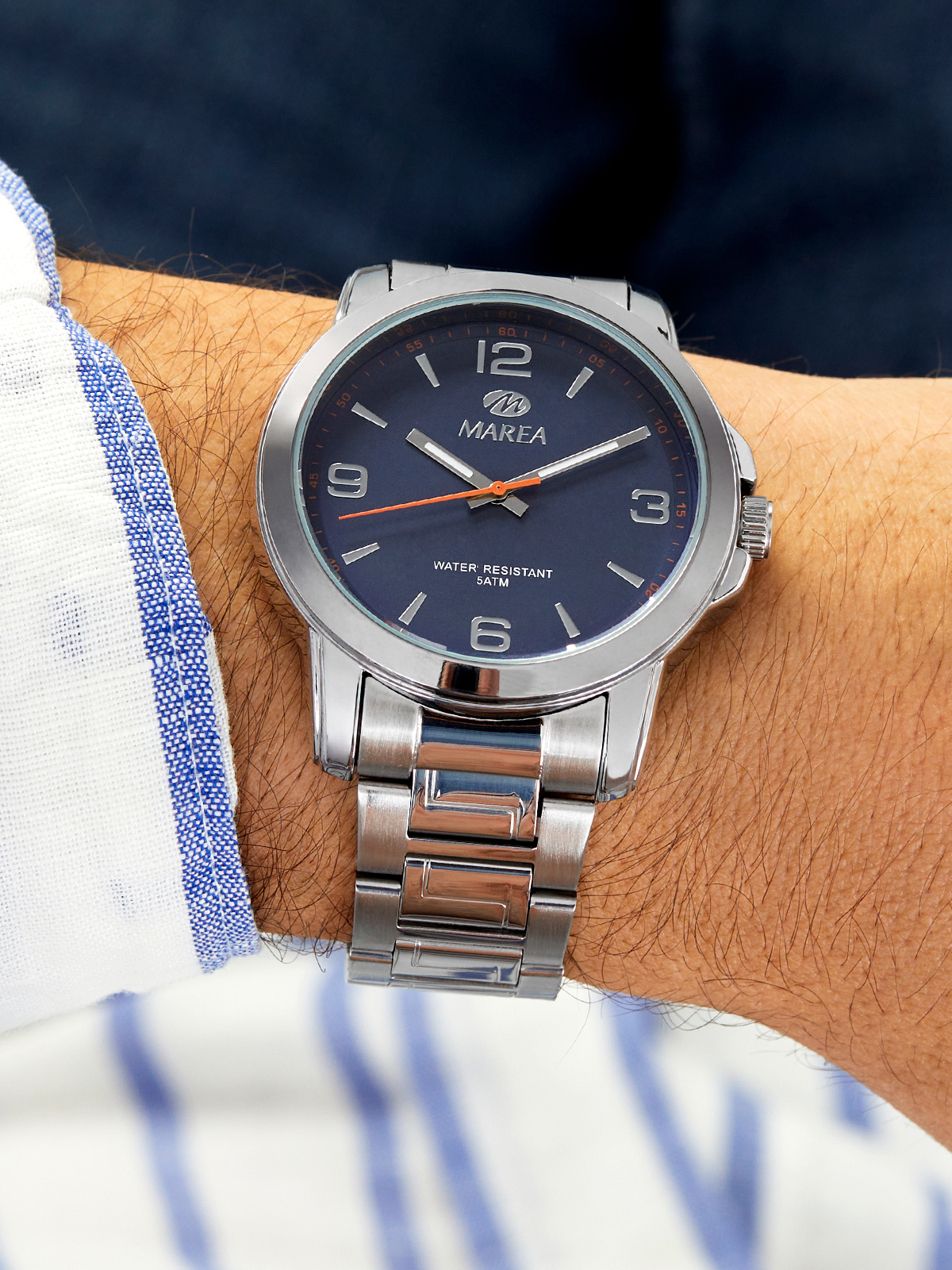 Movimiento japonés: 3 agujas Diámetro Caja: 44 mm. Material Caja: Metal Material Brazalete: Acero Esfera: Color azul Resistente al agua: 5 ATM