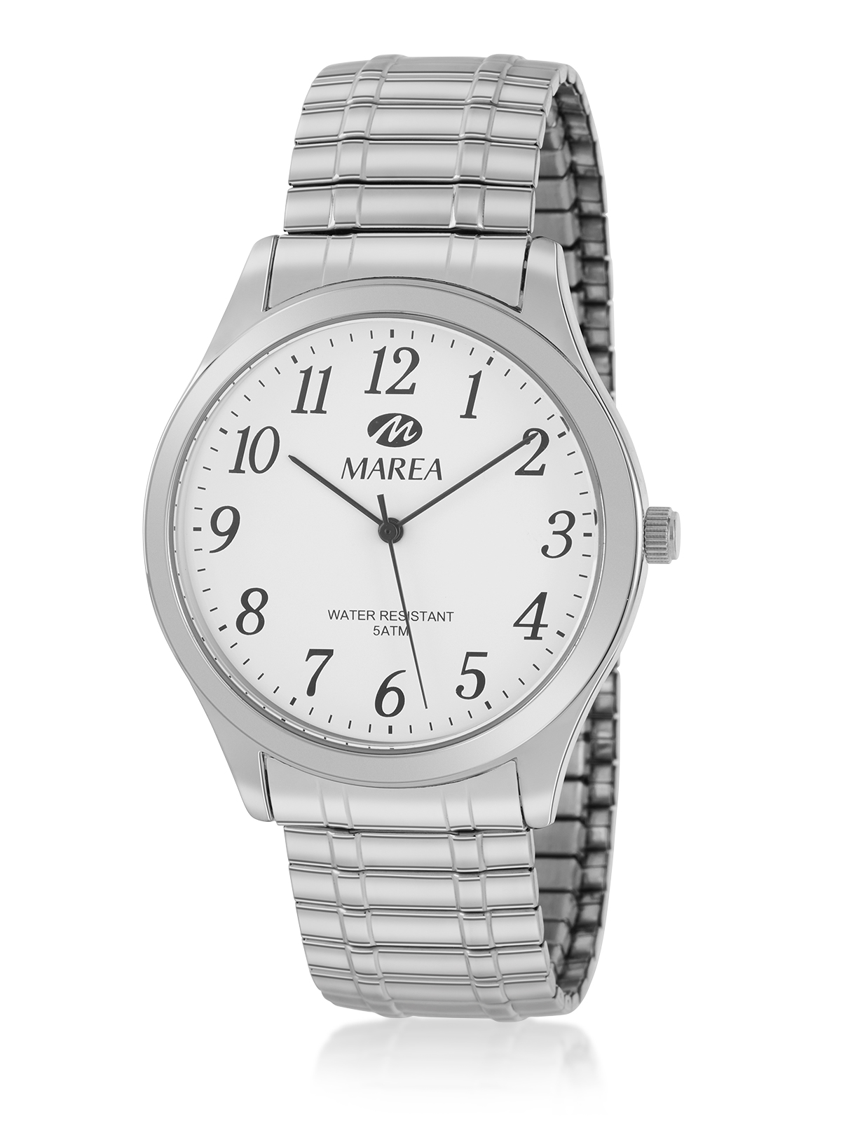 Movimiento japonés: 3 agujas Diámetro Caja: 40 mm. Material Caja: Metal Material Brazalete Elástico: Acero Esfera: Blanco con números arábigos Resistente al agua: 5 ATM