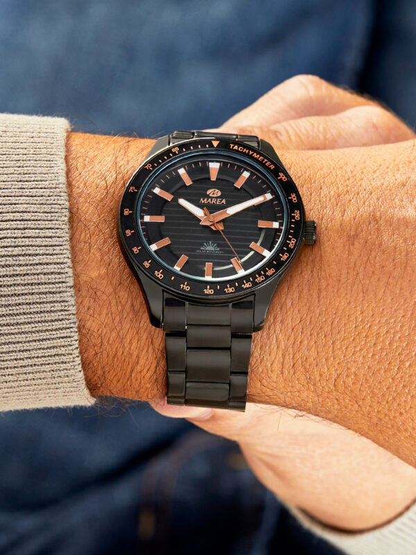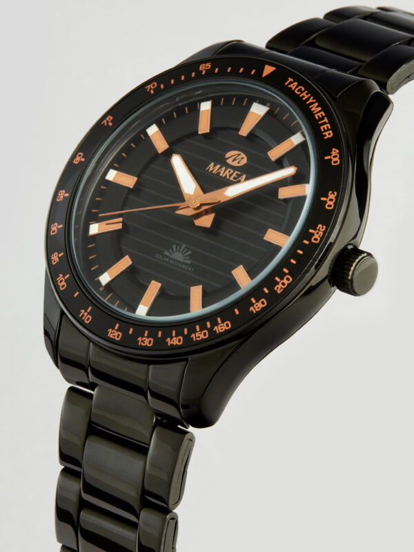 Movimiento japonés de carga solar: 3 agujas. Diámetro Caja: 42 mm. Material Caja: Metal. Material Brazalete: Acero/Steel. Resistente al agua: 5 ATM.