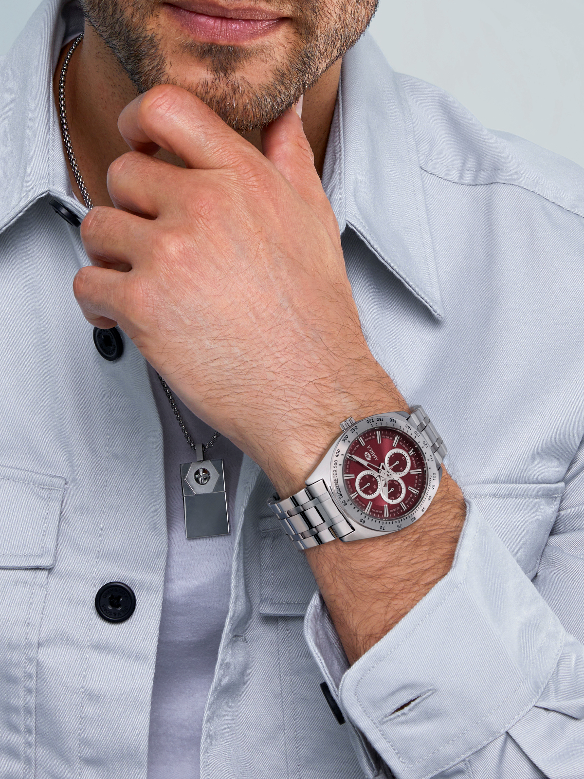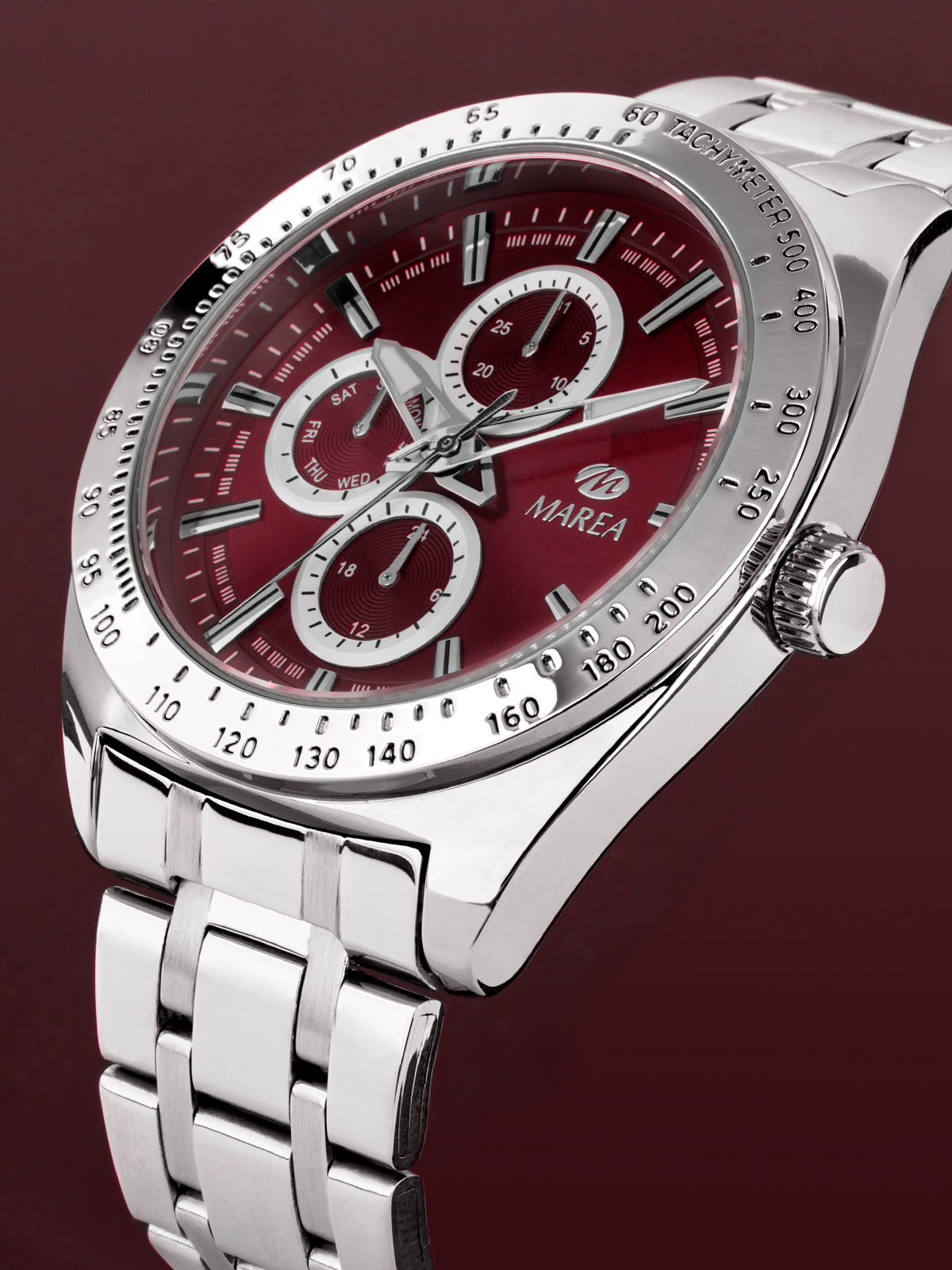 Movimiento japonés: 3 agujas multifunción con fecha, día de la semana y 24 horas. Diámetro Caja: 42 mm. Material Caja: Metal. Material Brazalete: Acero. Esfera: Color granate. Resistente al agua: 5 ATM.