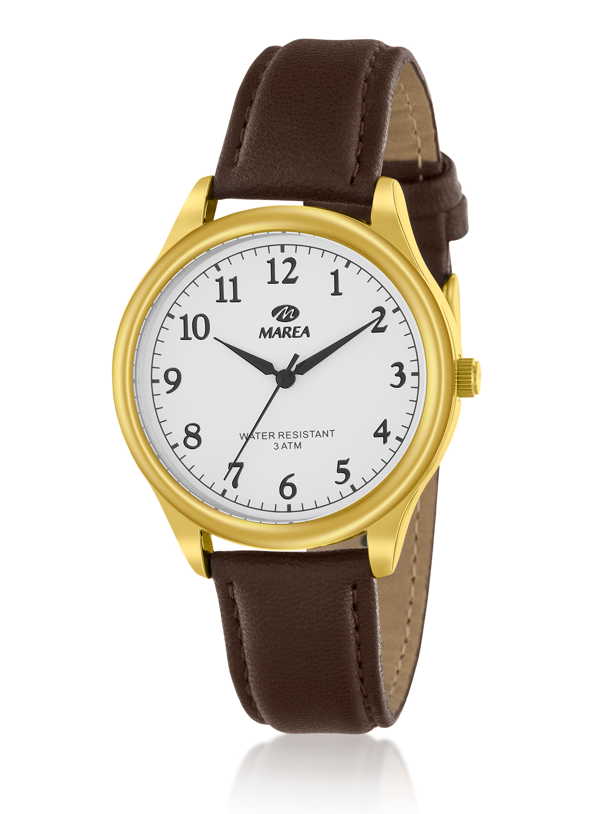 Movimiento japonés: 3 agujas. Diámetro Caja: 38 mm. Material Caja: Metal con tapa trasera y corona de acero. Material Brazalete: Piel color marrón oscuro con hebilla de acero. Esfera: Color blanco. Resistente al agua: 3 ATM.