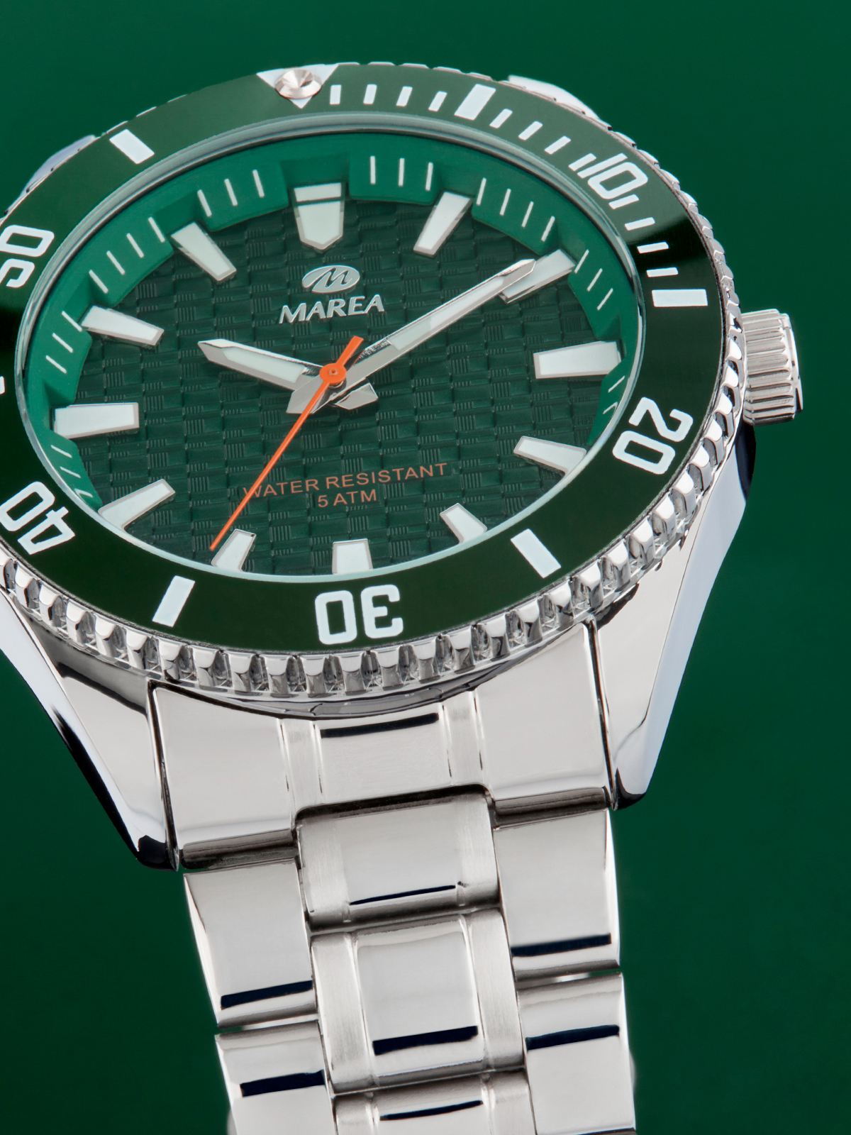 Movimiento japonés: 3 agujas. Diámetro Caja: 43 mm. Material Caja: Metal con bisel verde, con tapa trasera y corona de acero. Material Brazalete: Acero. Esfera: Color verde con segundero en color naranja. Resistente al agua: 5 ATM.