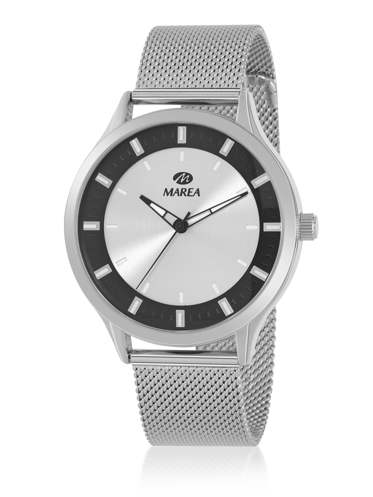 Reloj con movimiento japonés: 3 agujas.Esfera plateada con detalle en los índices de color negro.