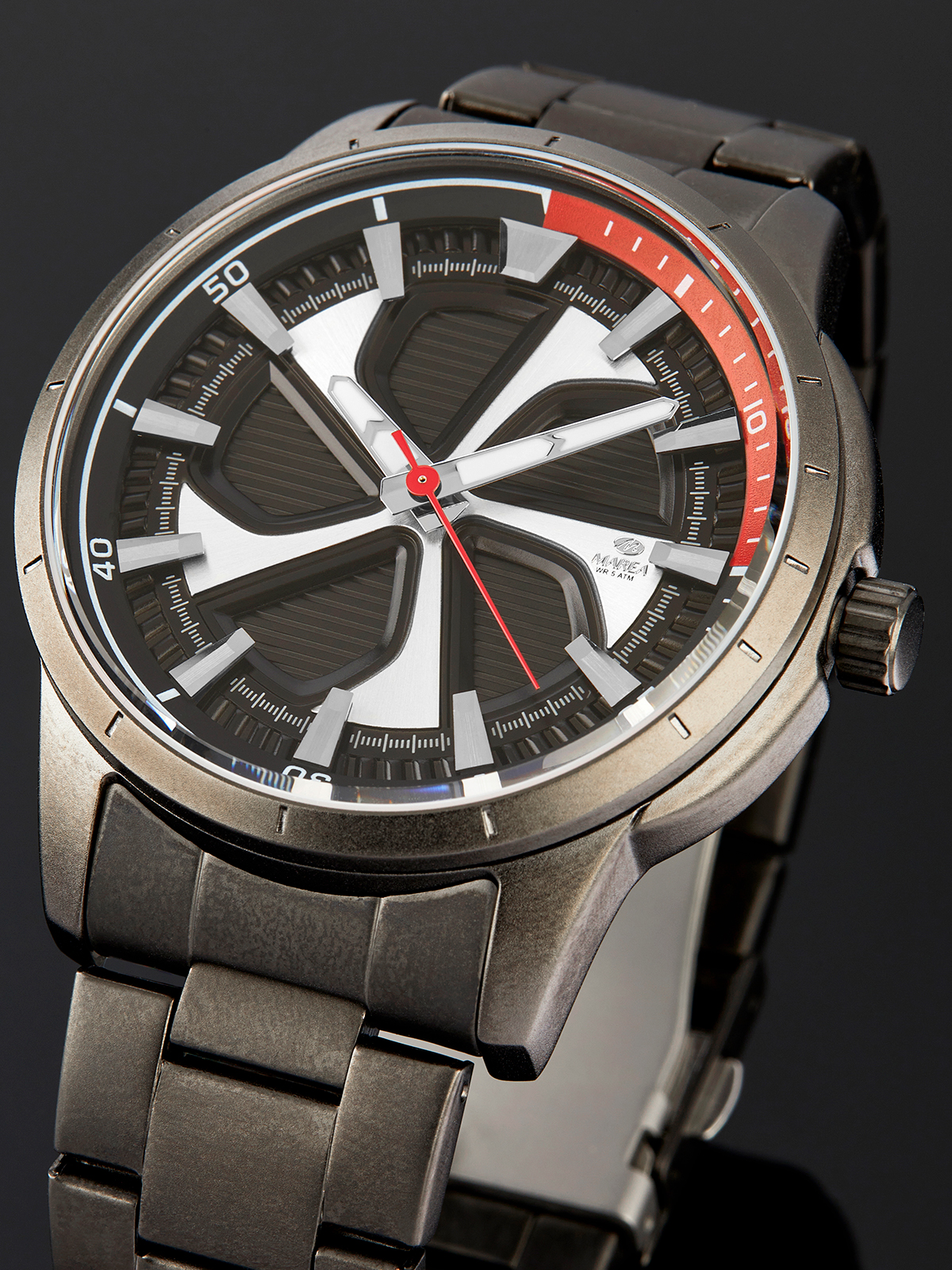 Movimiento japonés: 3 agujas. Diámetro Caja: 44 mm. Material Caja: Metal color negro. Material Brazalete: Acero color negro. Esfera: Color negro con detalles y segundero en color rojo. Resistente al agua: 5 ATM.