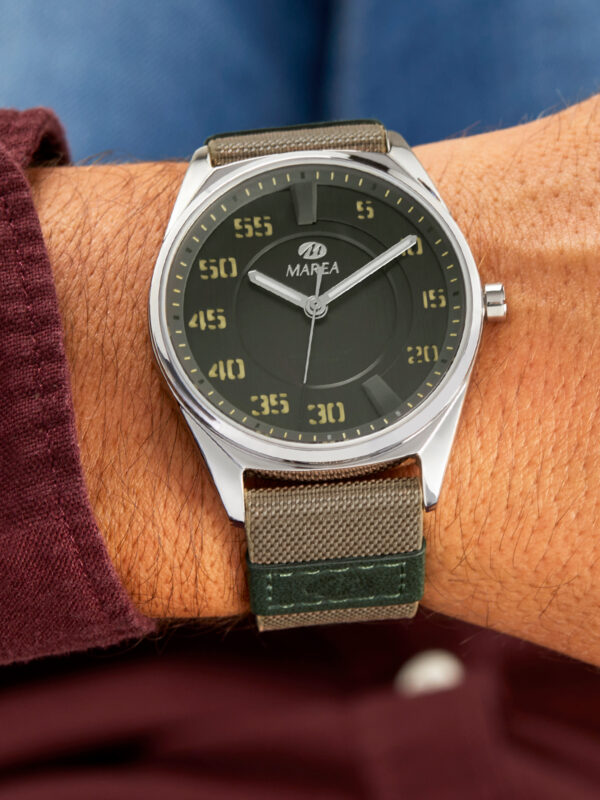 Movimiento japonés: 3 agujas. Diámetro Caja: 42 mm. Material Caja: Metal. Material Brazalete: Piel con acabado téxtil color beige y detalles en color verde oscuro. Esfera: Color gris oscuro con detalles en beige. Resistente al agua: 5 ATM.