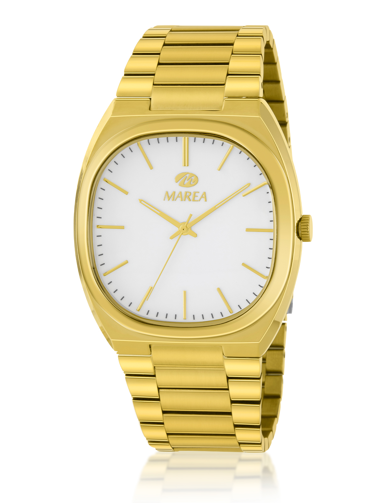 Reloj con movimiento japonés de tres agujas. Esfera de color blanco con índices y agujas doradas. Acabado dorado.