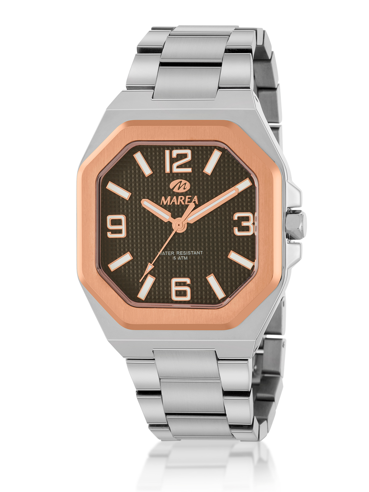 Movimiento japonés de tres agujas. Bisel rose gold con esfera de diseño octogonal de color marrón. Acabado plateado.