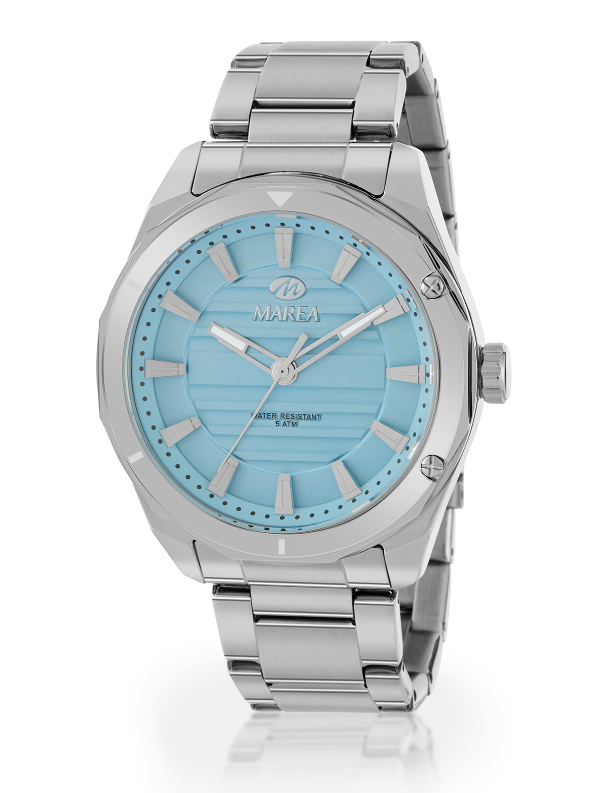 Movimiento japonés: 3 agujas. Esfera azul claro. Acabado plateado. Diámetro Caja: 44mm. Material Caja: Metal. Material Brazalete: Acero/Steel. Resistente al agua: 5ATM.