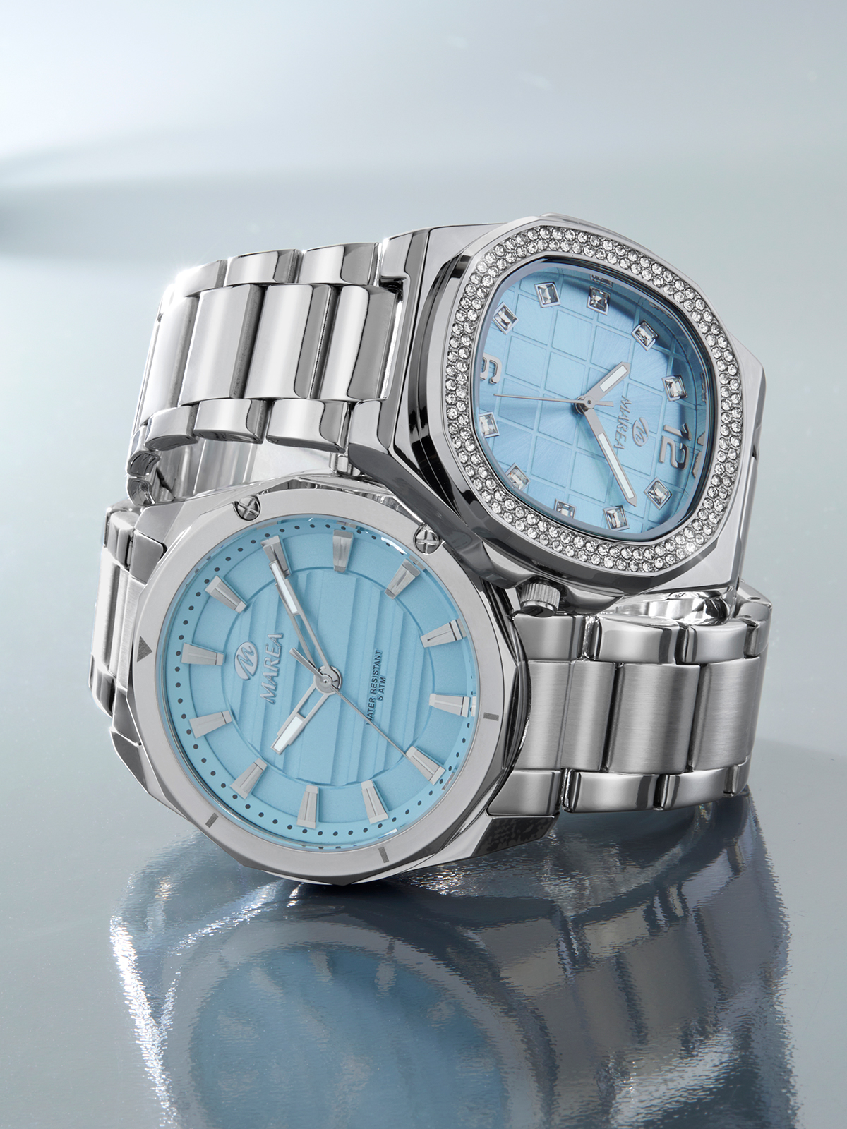 Movimiento japonés: 3 agujas. Esfera azul claro. Acabado plateado. Diámetro Caja: 44mm. Material Caja: Metal. Material Brazalete: Acero/Steel. Resistente al agua: 5ATM.