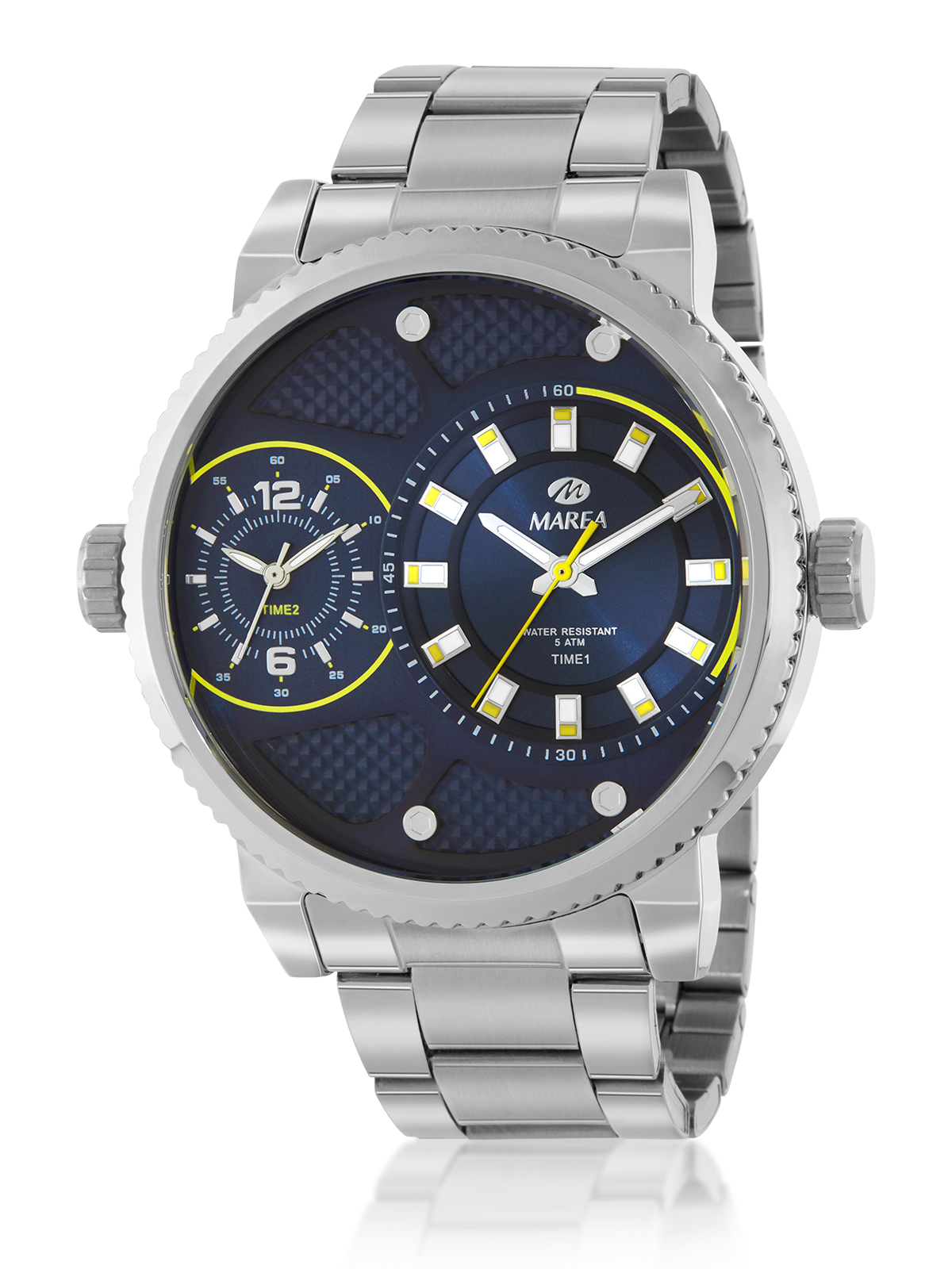 Movimiento japonés: 3 agujas Diámetro Caja: 50mm. Material Caja: Metal Material Brazalete: Acero/Steel Esfera: Color azul oscuro con toques amarillos. Resistente al agua: 5 ATM