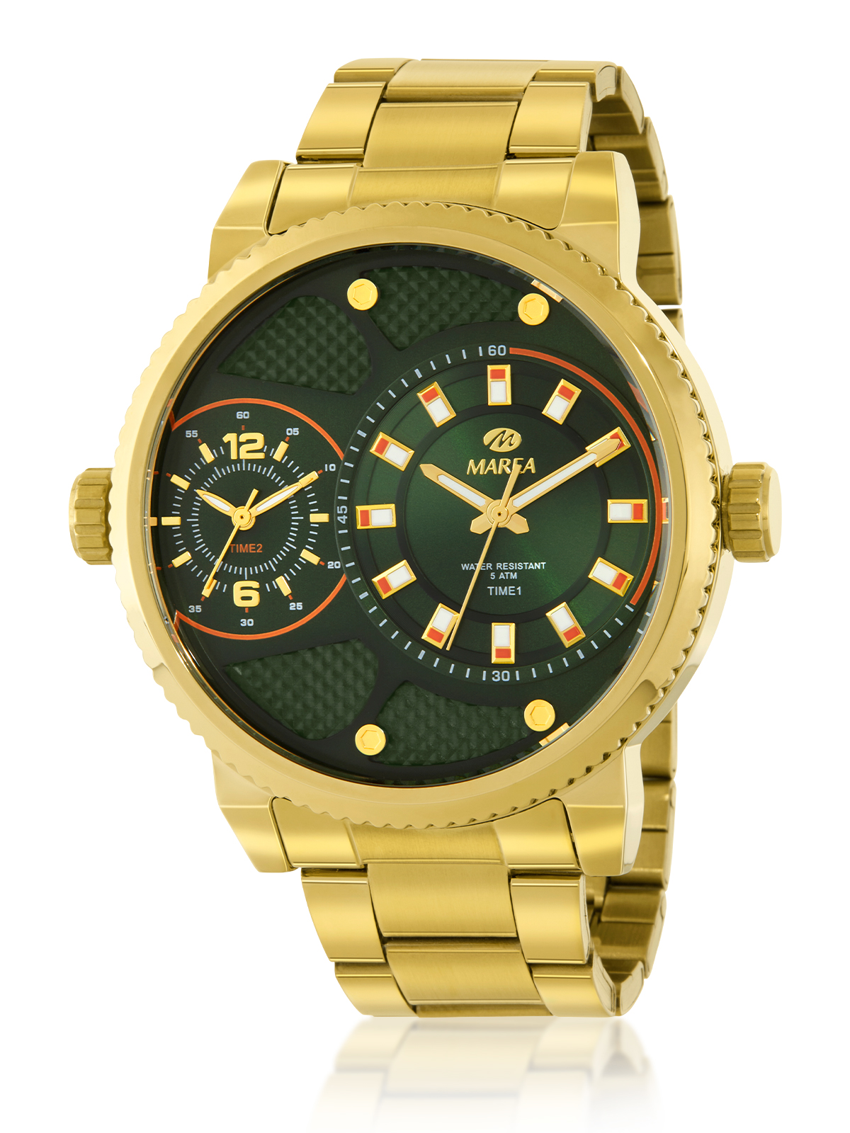 Movimiento japonés: 3 agujas Diámetro Caja: 50mm. Material Caja: Metal Material Brazalete: Acero/Steel Esfera: Color verde oscuro con toques naranjas. Resistente al agua: 5 ATM