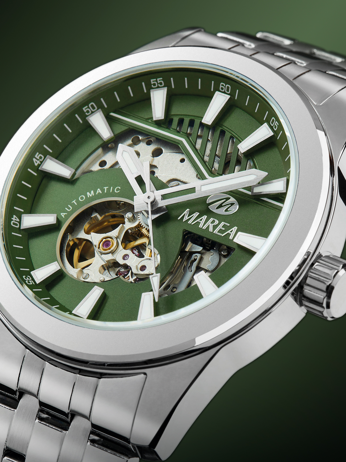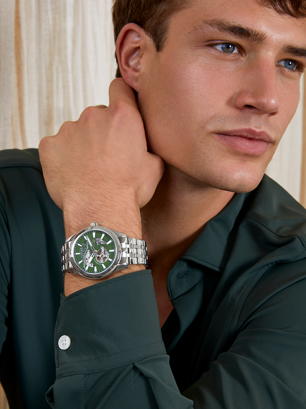 Reloj automático steel con movimiento japonés de tres agujas. Esfera de color verde. Acabado plateado.