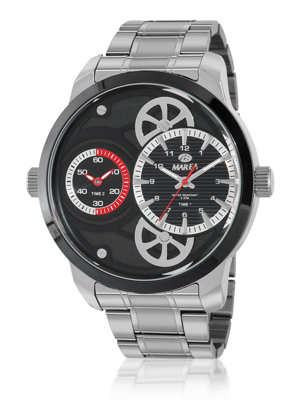 Movimiento japonés: 3 agujas. Esfera negra. Acabado plateado. Diámetro Caja: 50mm. Material Caja: Metal. Material Brazalete: Acero/Steel. Resistente al agua: 5ATM.
