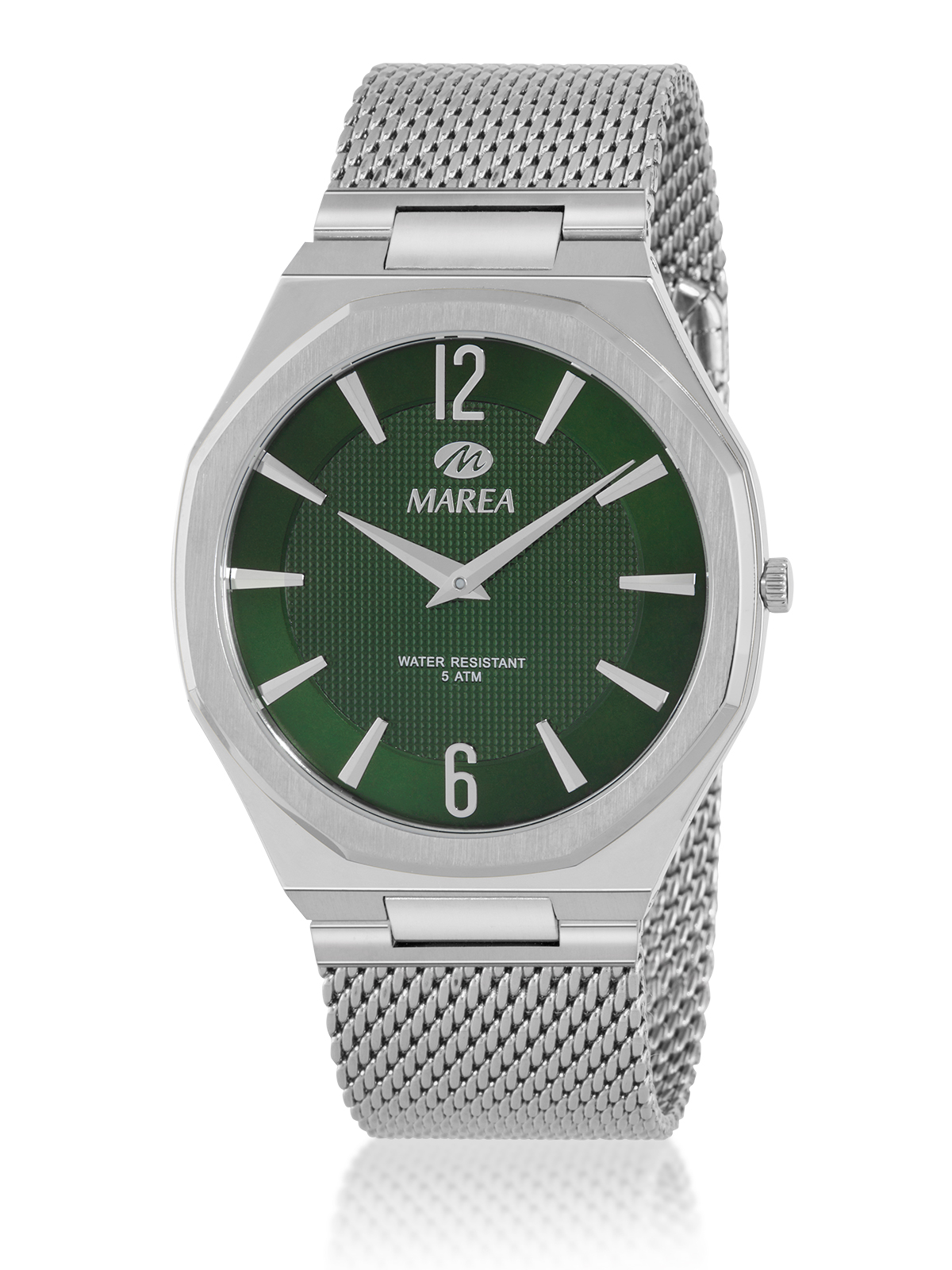 Reloj analógico con textura dentro de la esfera verde. Acabado plateado. Diámetro Caja: 42mm. Material Caja: Acero/Steel. Material Brazalete: Acero/Steel. Resistente al agua: 5ATM.