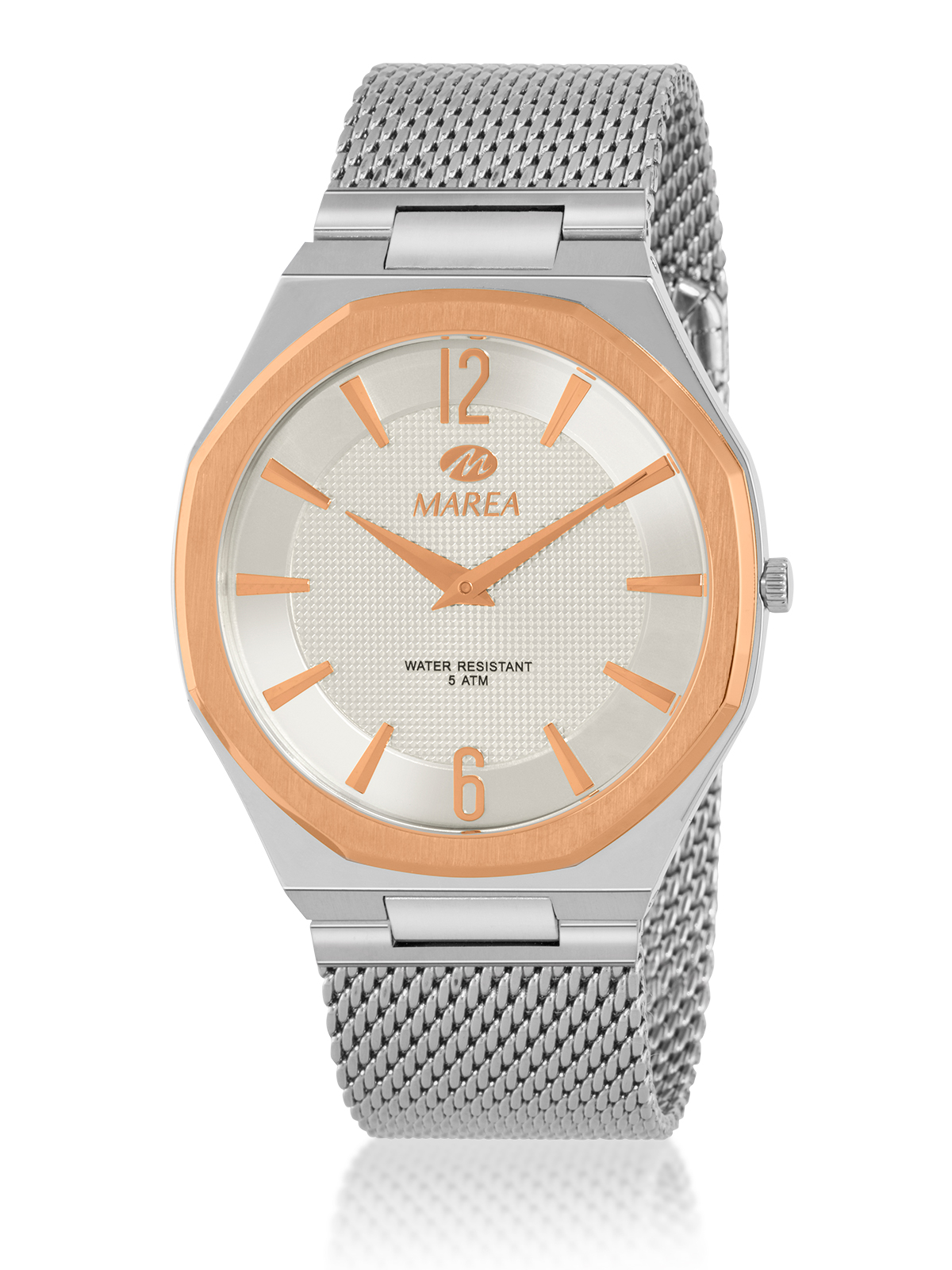 Reloj analógico con textura dentro de la esfera blanca y bisel Rose Gold. Acabado plateado. Diámetro Caja: 42mm. Material Caja: Acero/Steel. Material Brazalete: Acero/Steel. Resistente al agua: 5ATM.