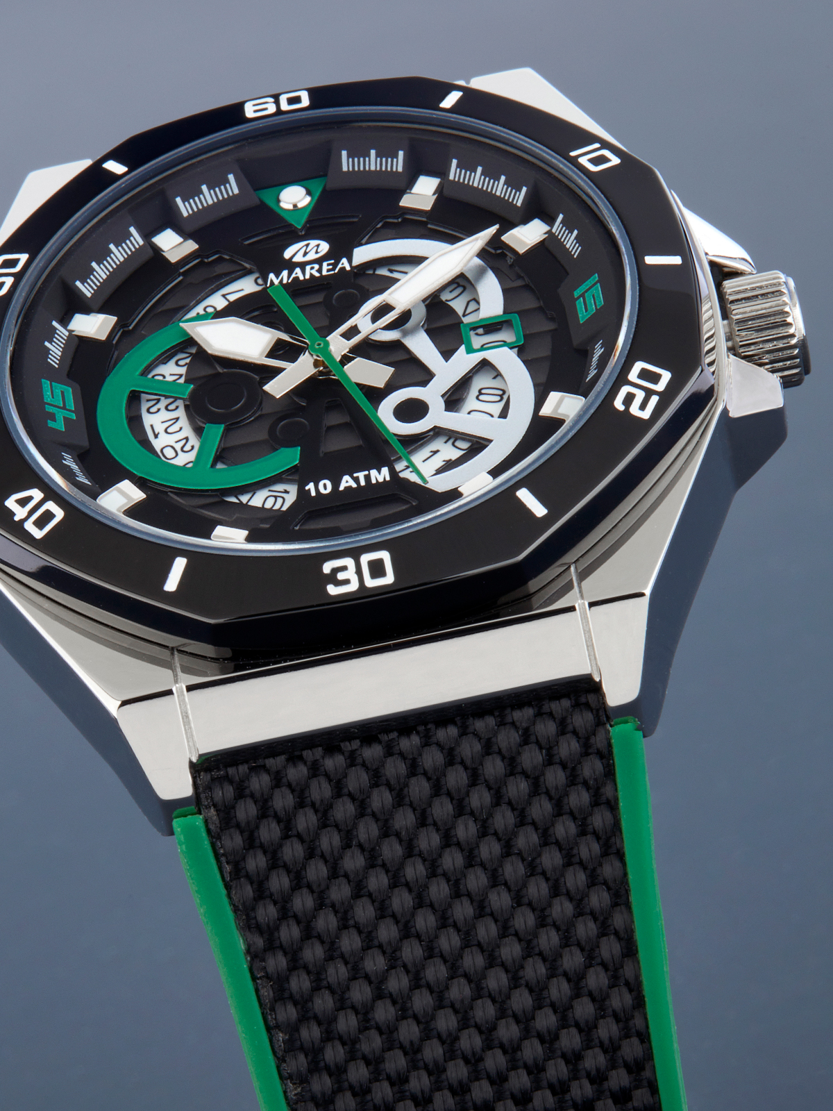 Material Brazalete: Nylon color negro sobre correa de silicona color verde.