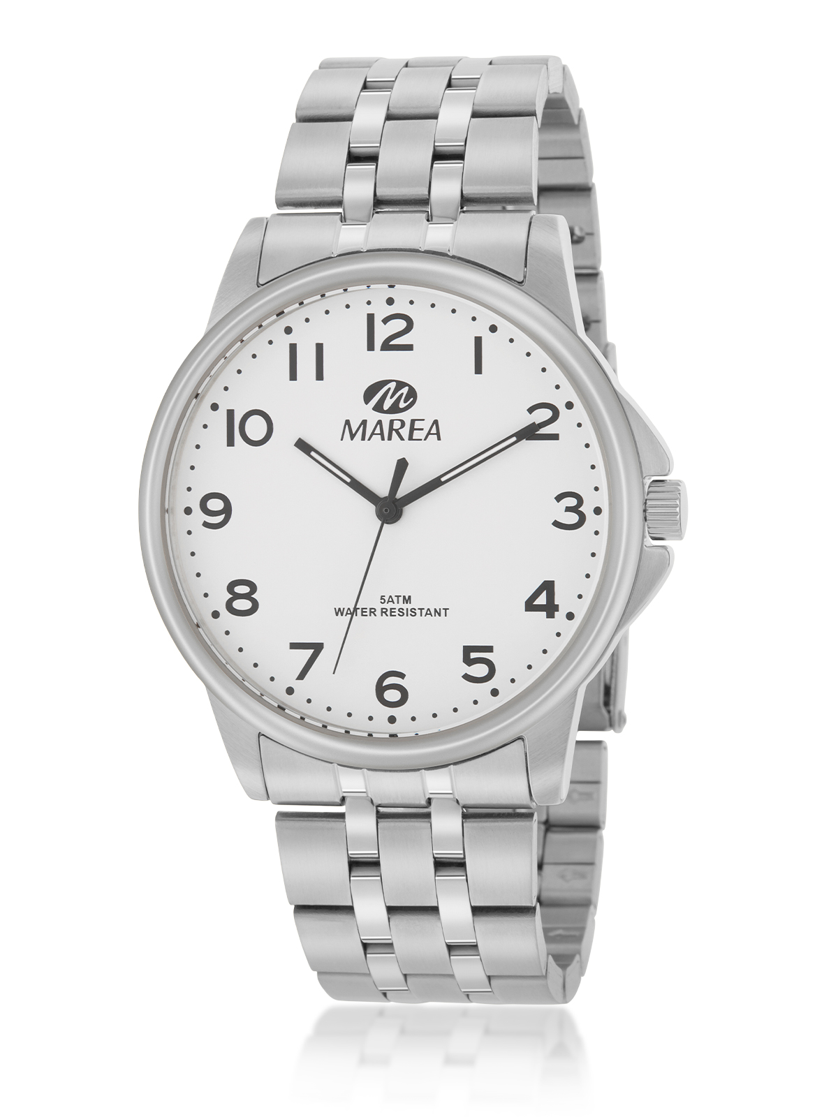 Movimiento japonés: 3 agujas Diámetro Caja: 42 mm. Material Caja: Acero Material Brazalete: Acero Esfera: Color blanco Resistente al agua: 5 ATM