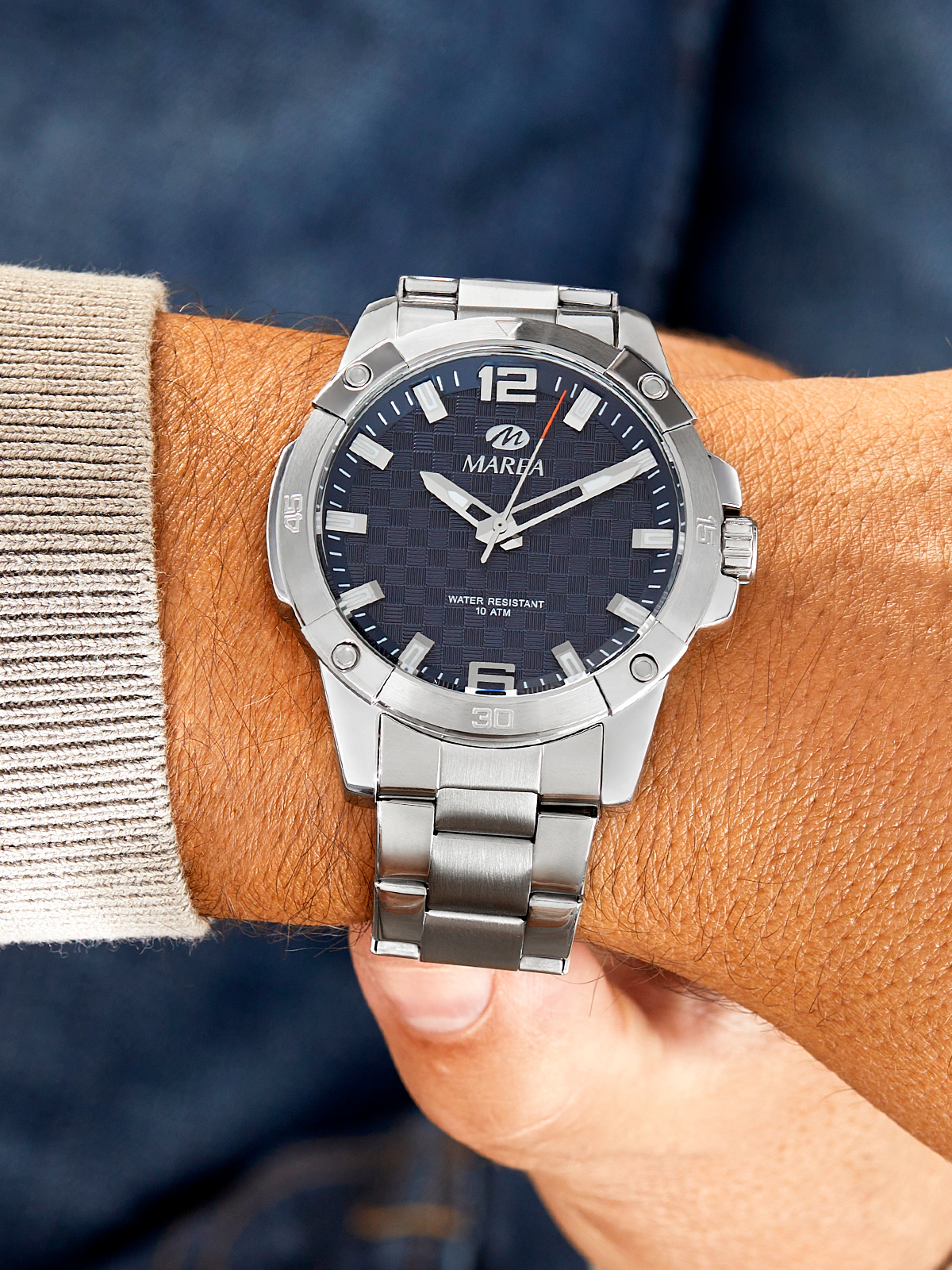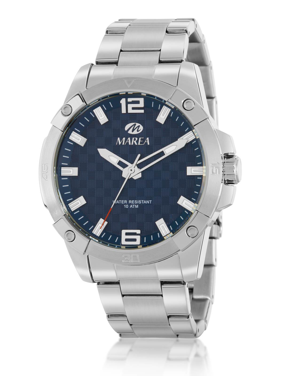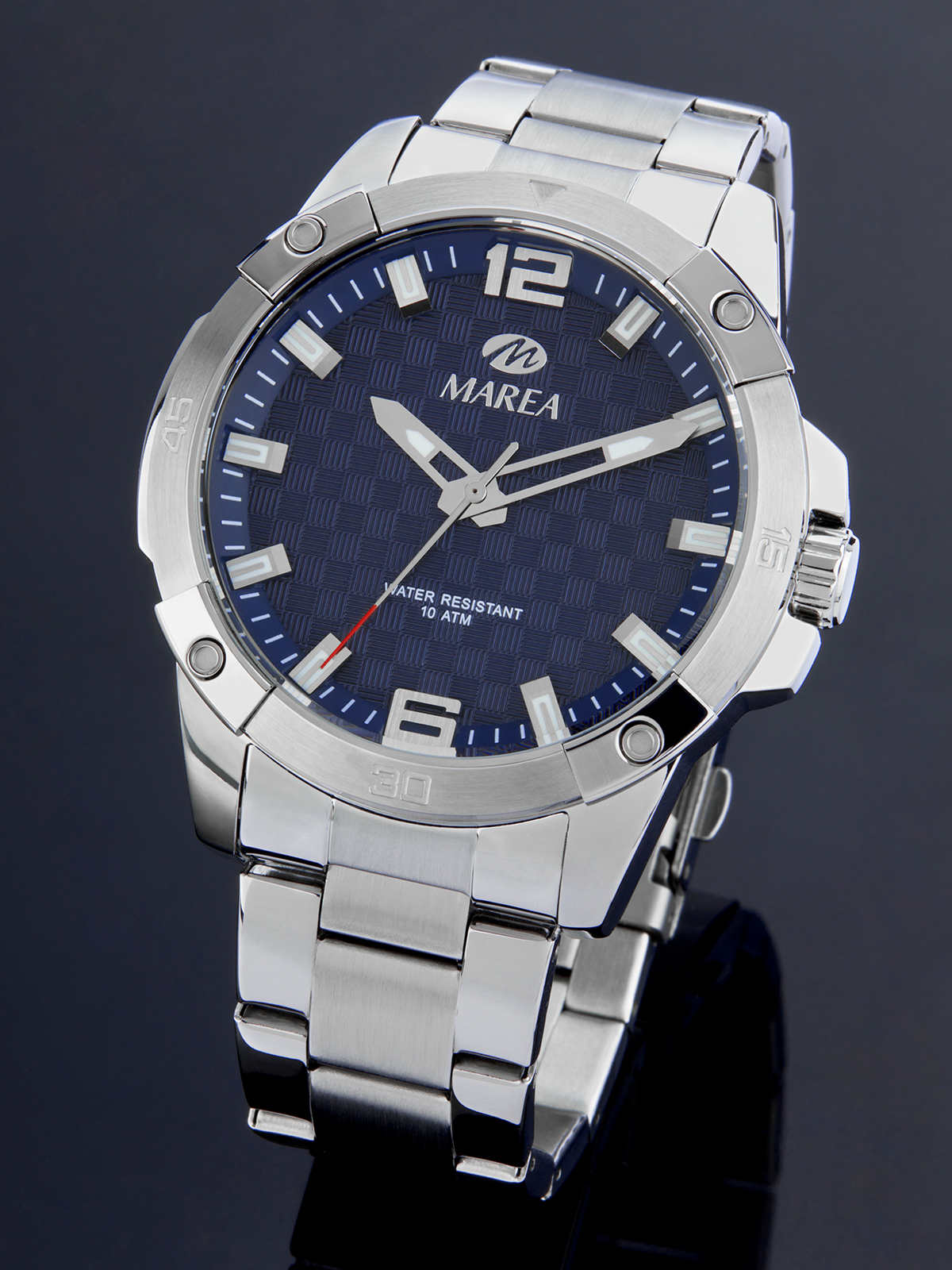 Movimiento japonés: 3 agujas STEEL. Diámetro Caja: 44 mm. Material Caja: Metal. Material Brazalete: Acero. Esfera: Color azul. Resistente al agua: 10 ATM.