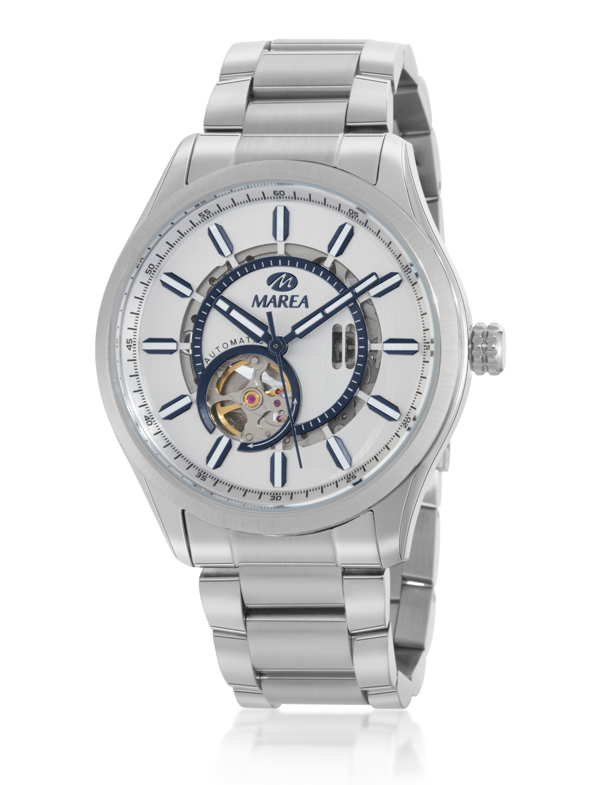 Movimiento japonés automático: 3 agujas. Diámetro Caja: 43 mm. Material Caja: Acero. Material Brazalete: Acero. Esfera: Color plata con detalles en azul y movimiento automático visible. Resistente al agua: 5 ATM.