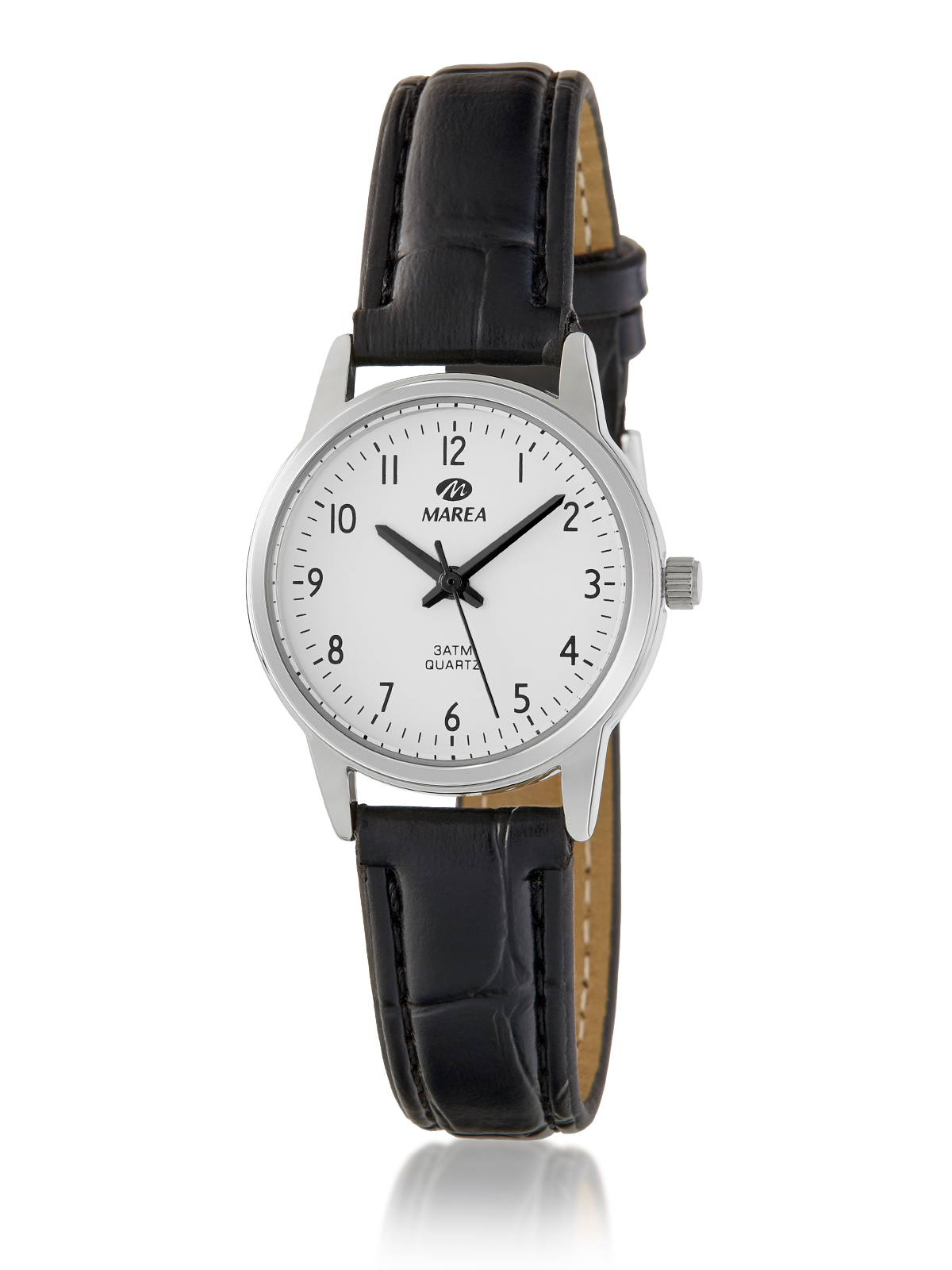 Movimiento japonés: 3 agujas Diámetro Caja: 28 mm. Material Caja: Metal Material Brazalete: Piel color negro Esfera: Color blanco, bisel en acero Resistente al agua: 3 ATM