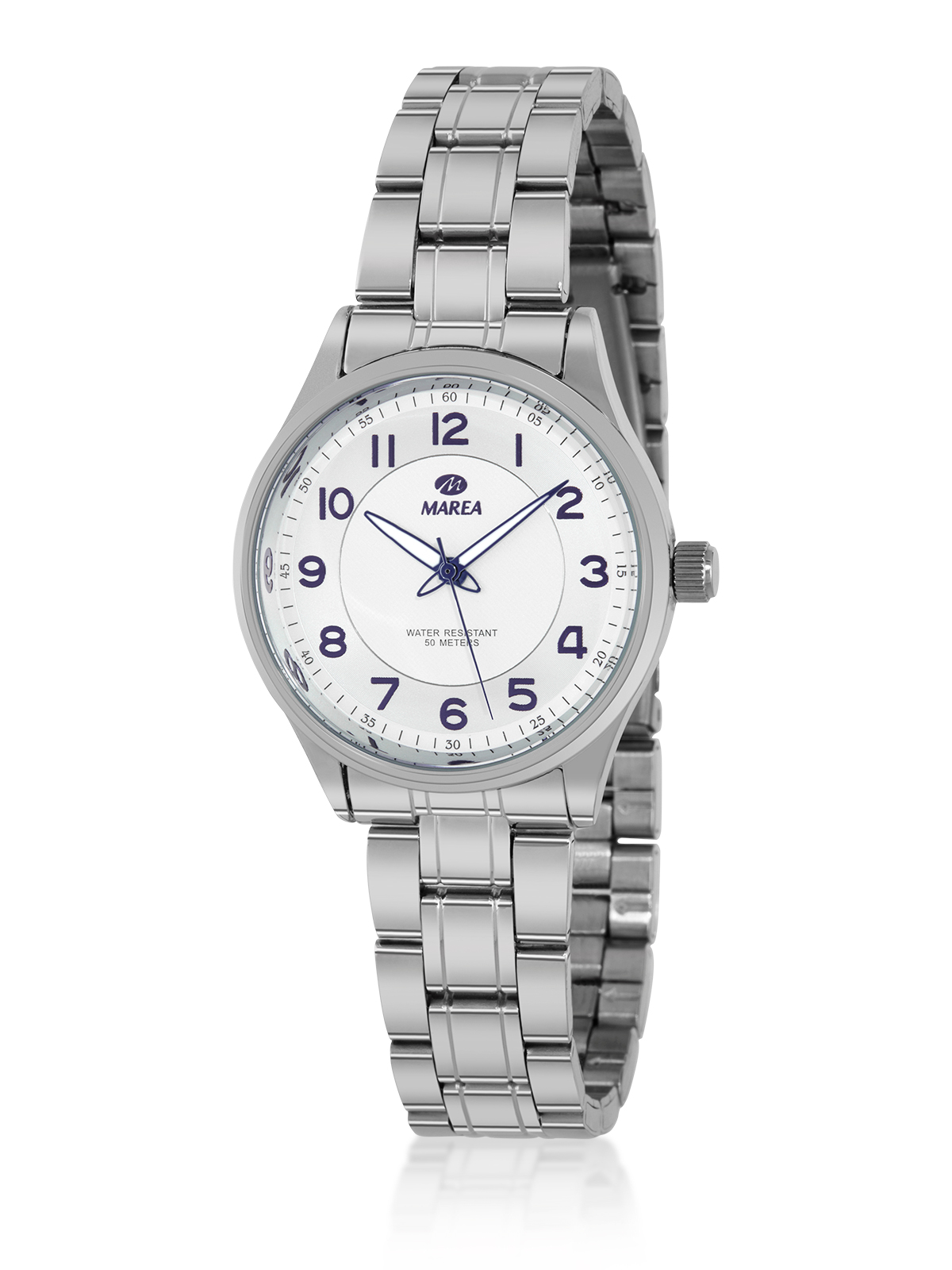 Reloj de mujer con esfera blanca, índices y agujas en azul marino. Correa de armis plateada.