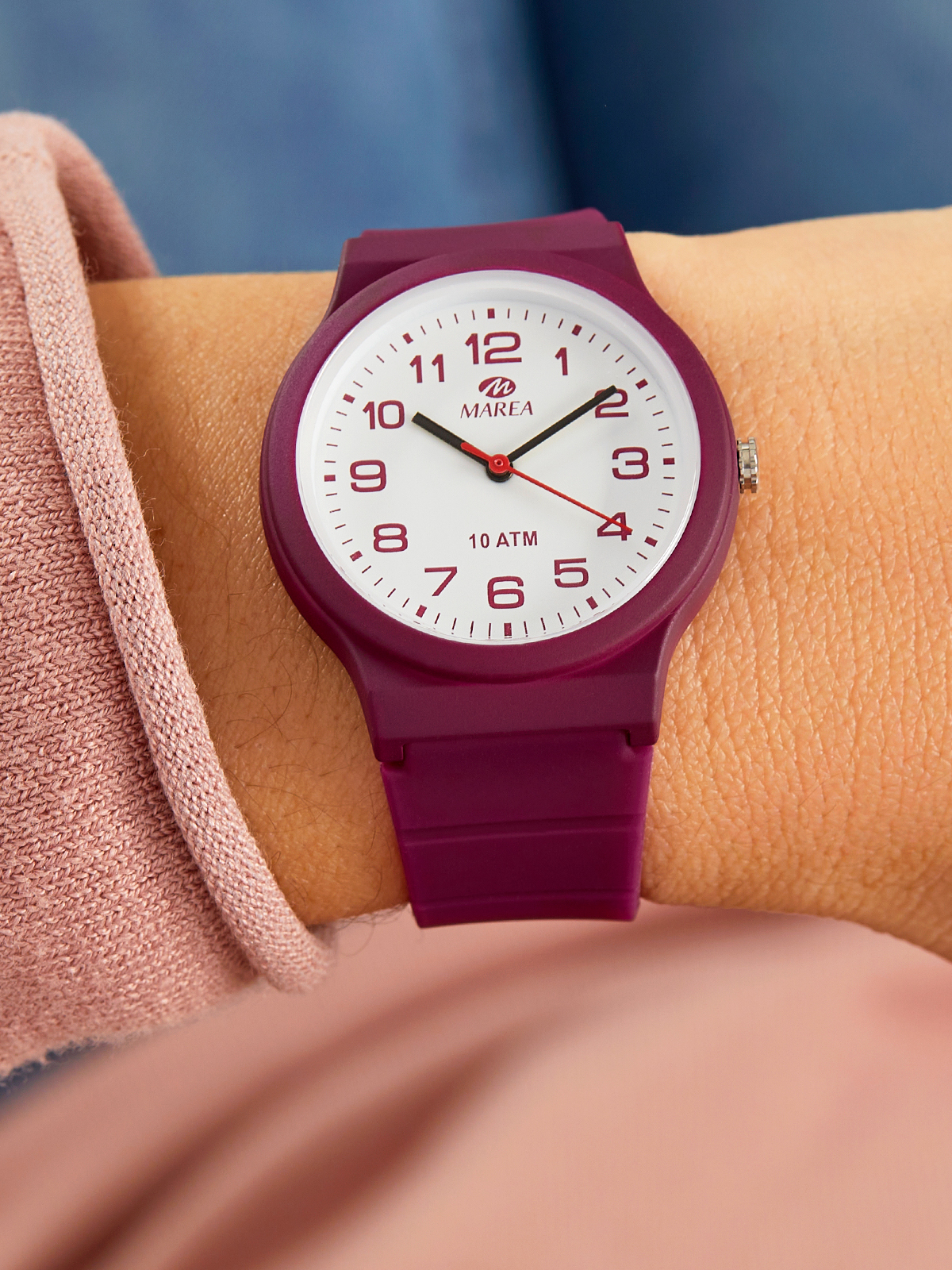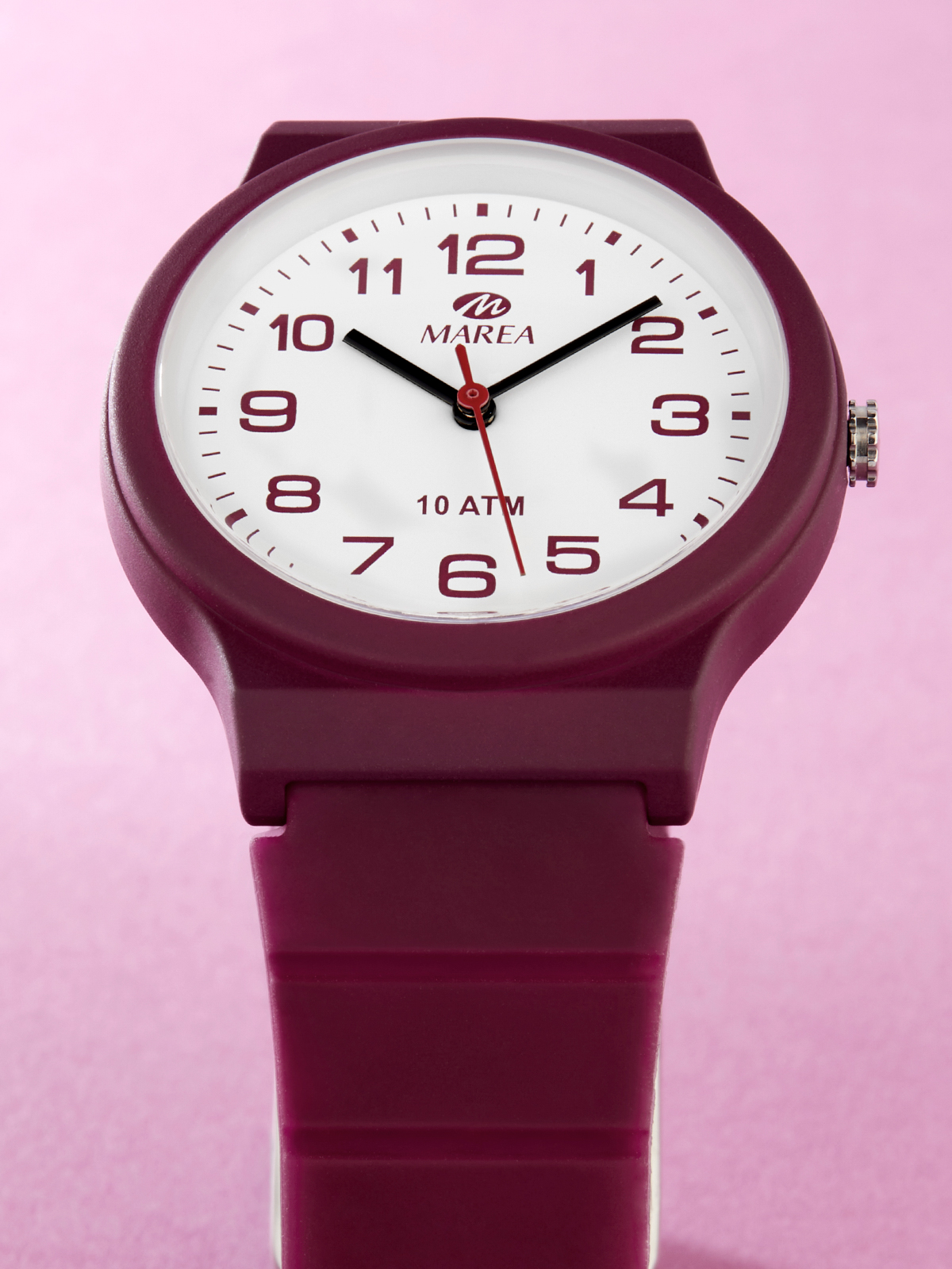 Movimiento japonés: 3 agujas. Diámetro Caja: 34 mm. Material Caja: Plástico color burdeos. Material Brazalete: Silicona color burdeos. Esfera: Color blanco con segundero color rojo. Resistente al agua: 10 ATM.