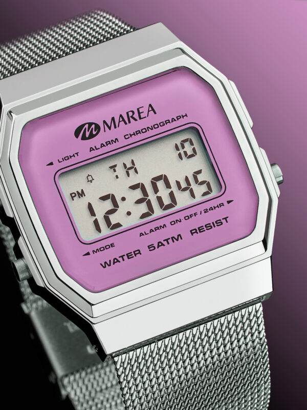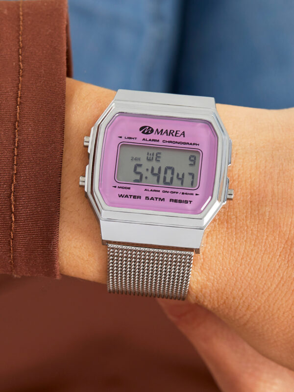 Reloj digital pantalla LCD color lila Diámetro Caja: 34×39 mm. Material Caja: Plástico Material Brazalete: Acero Resistente al agua: 5 ATM