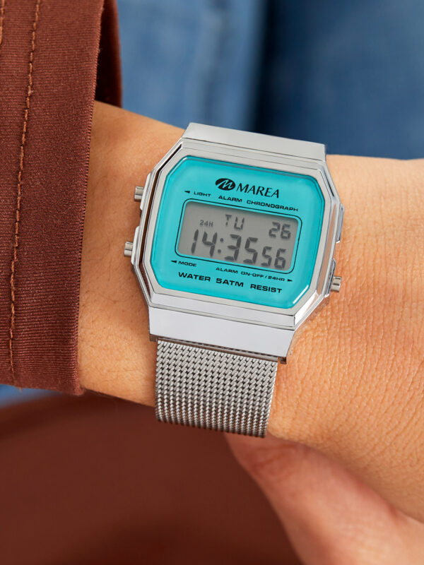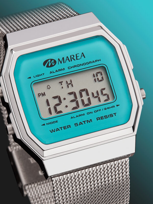 Reloj digital pantalla LCD color azul Diámetro Caja: 34×39 mm. Material Caja: Plástico Material Brazalete: Acero Resistente al agua: 5 ATM