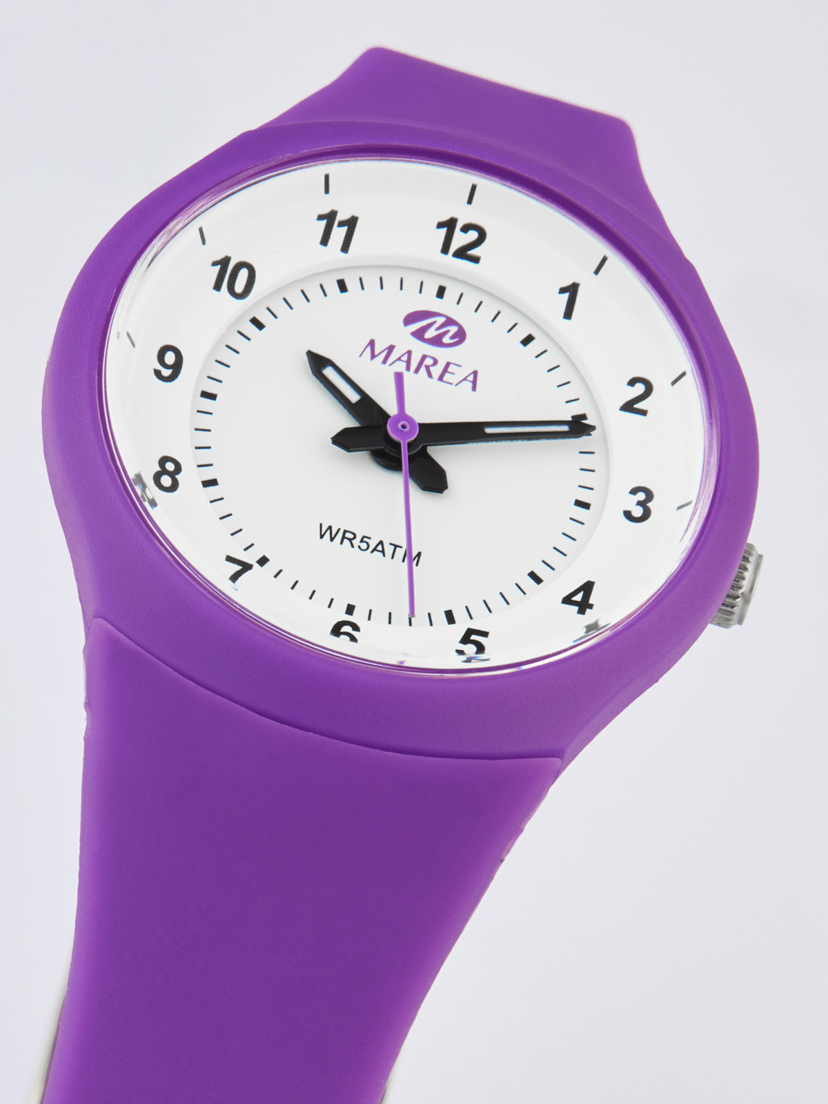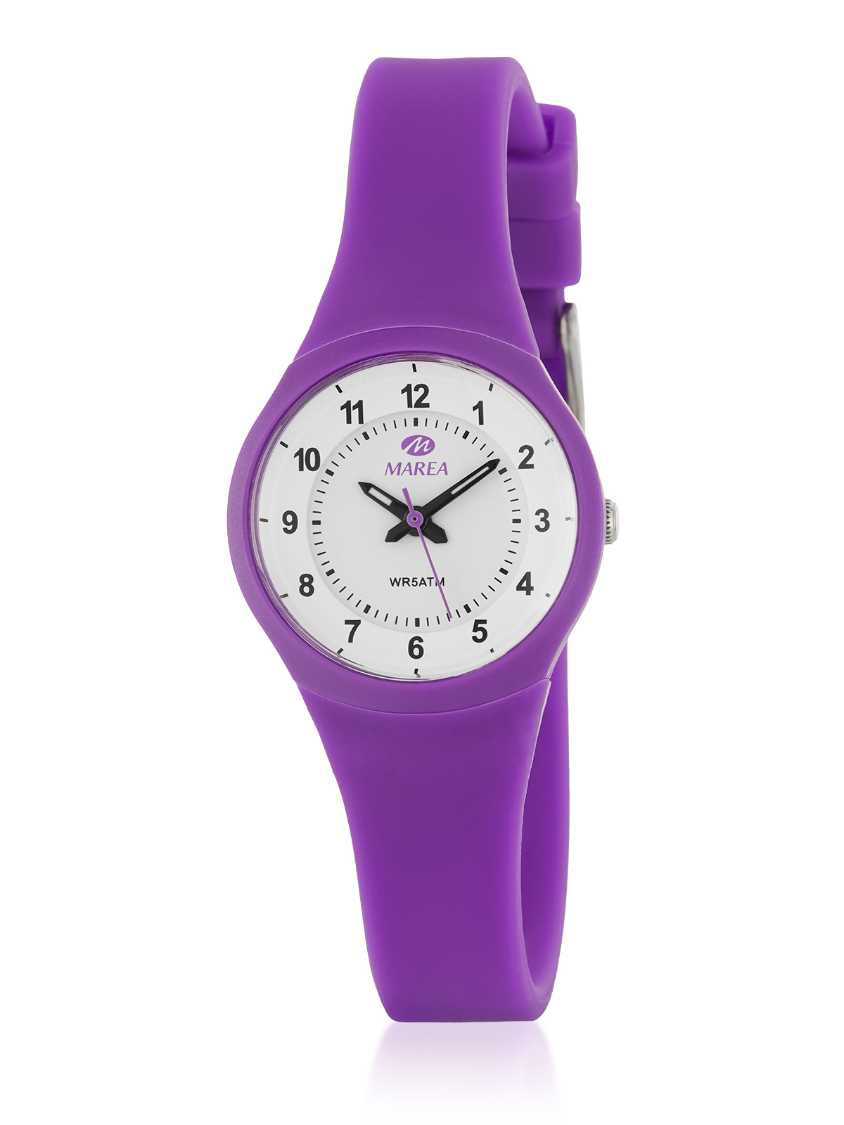 Movimiento japonés: 3 agujas Diámetro Caja: 28 mm. Material Caja: Plástico Material Brazalete: Silicona color lila Esfera: Color blanco Resistente al agua: 5 ATM