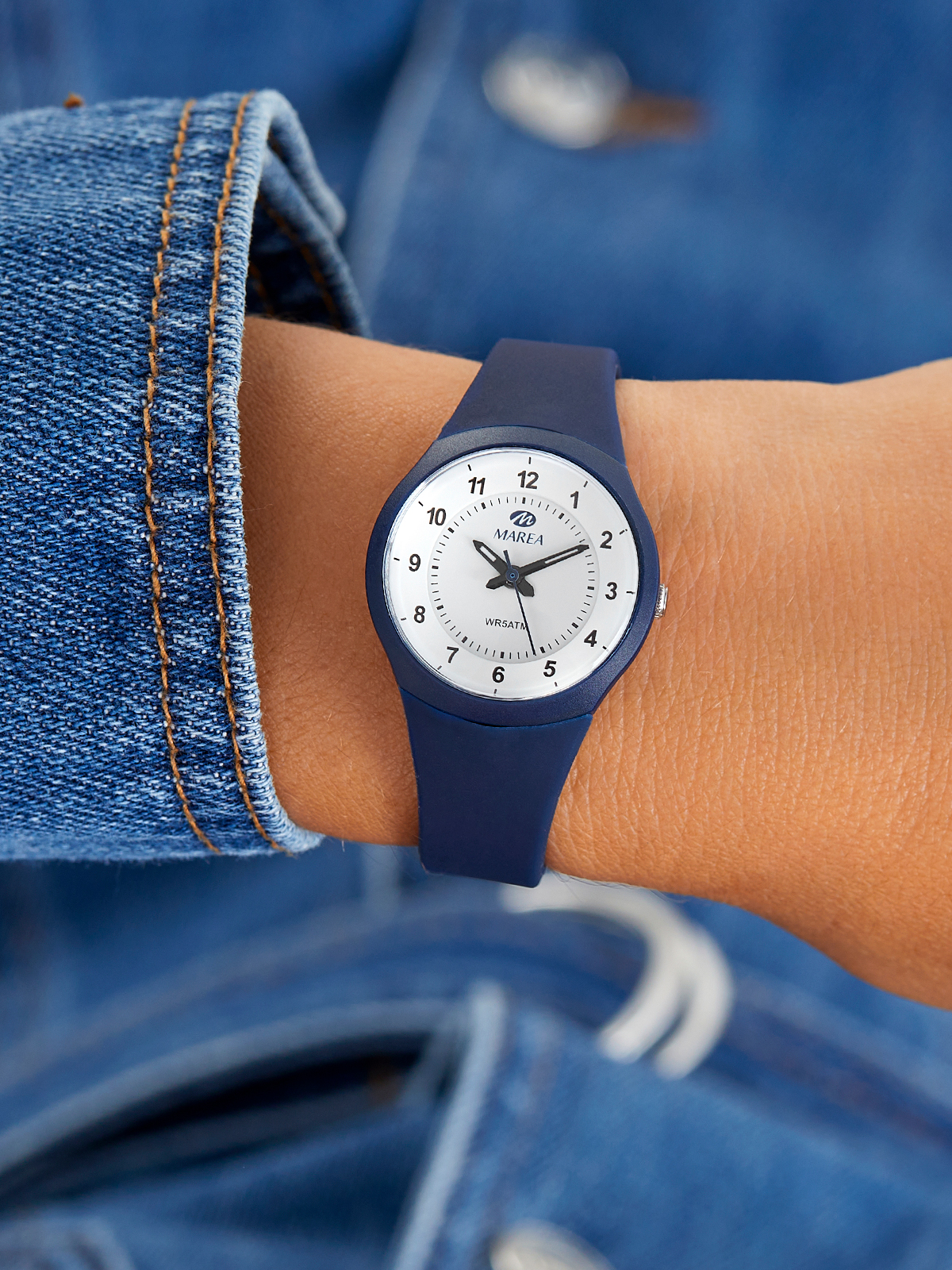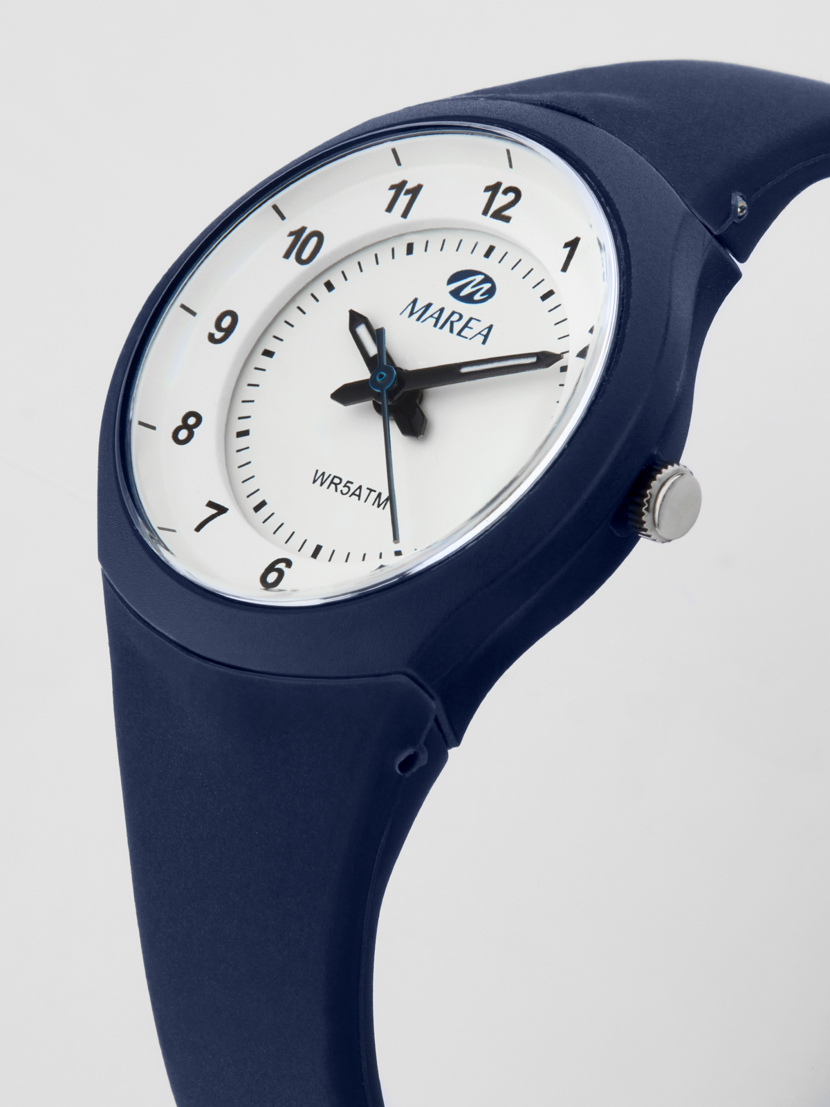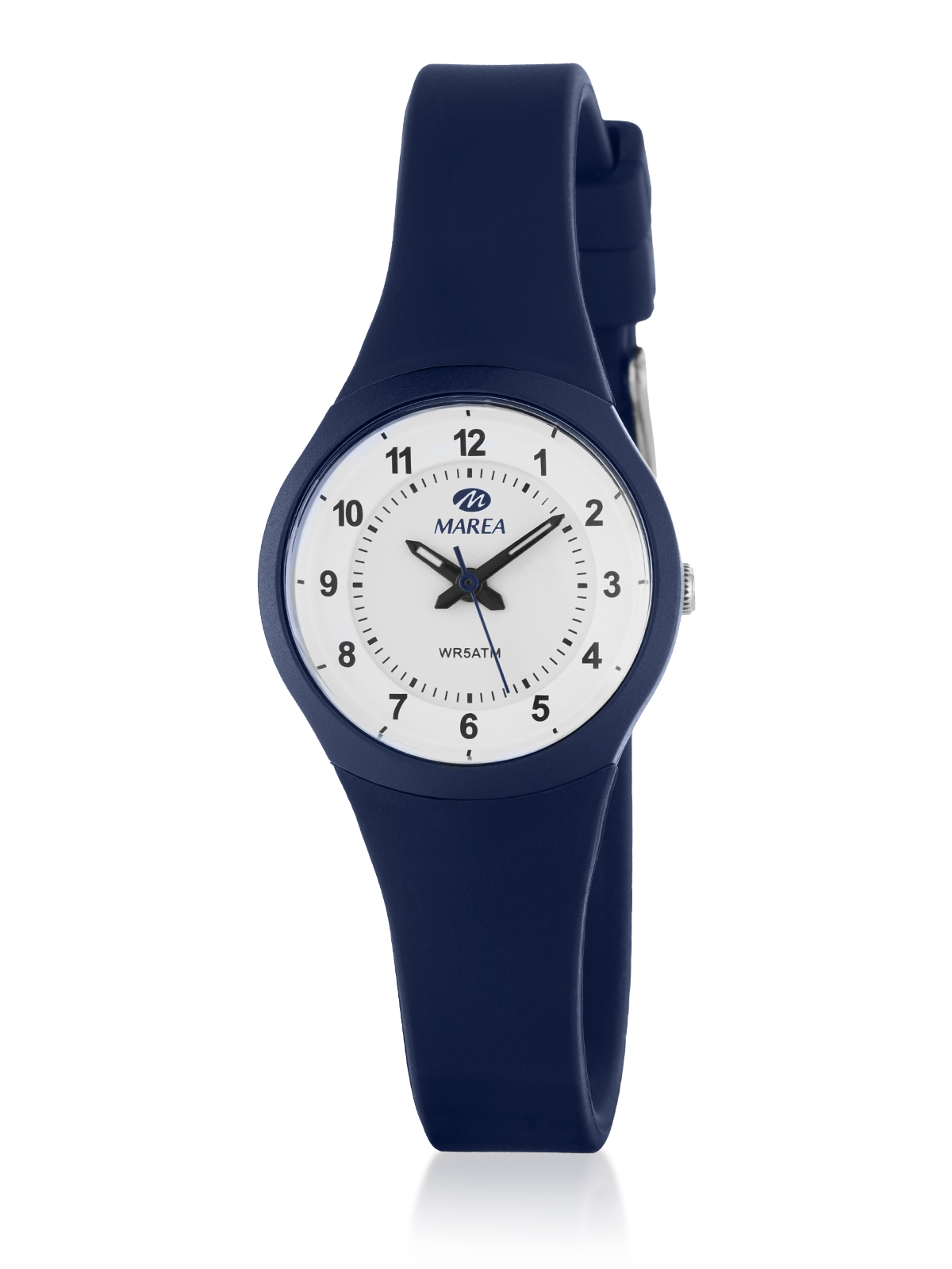 Movimiento japonés: 3 agujas Diámetro Caja: 28 mm. Material Caja: Plástico Material Brazalete: Silicona color azul oscuro Esfera: Color blanco Resistente al agua: 5 ATM