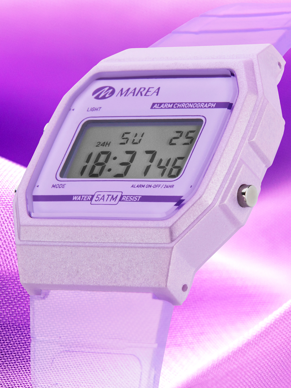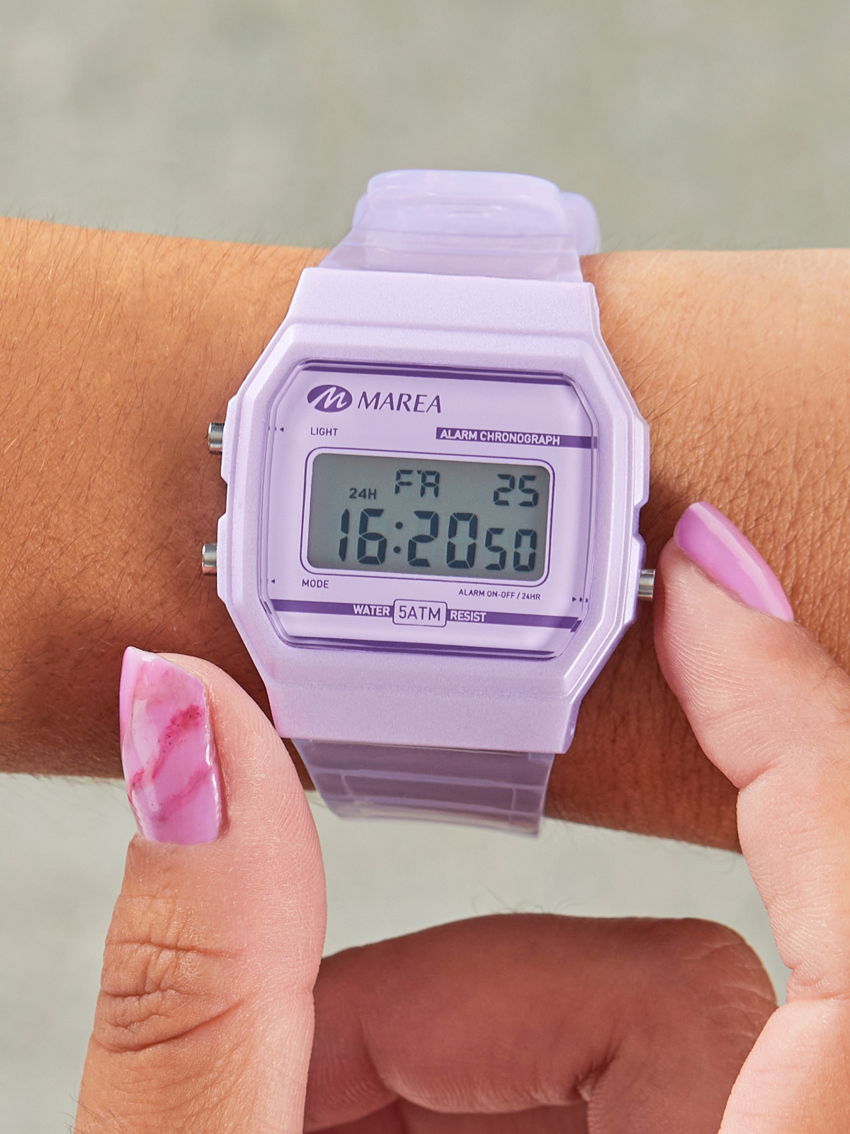 Movimiento japonés: pantalla LCD. Diámetro Caja: 33 x 38,5 mm. Material Caja: Plástico color lila claro. Material Brazalete: Plástico color lila claro transparente. Esfera: Color lila claro. Resistente al agua: 5 ATM