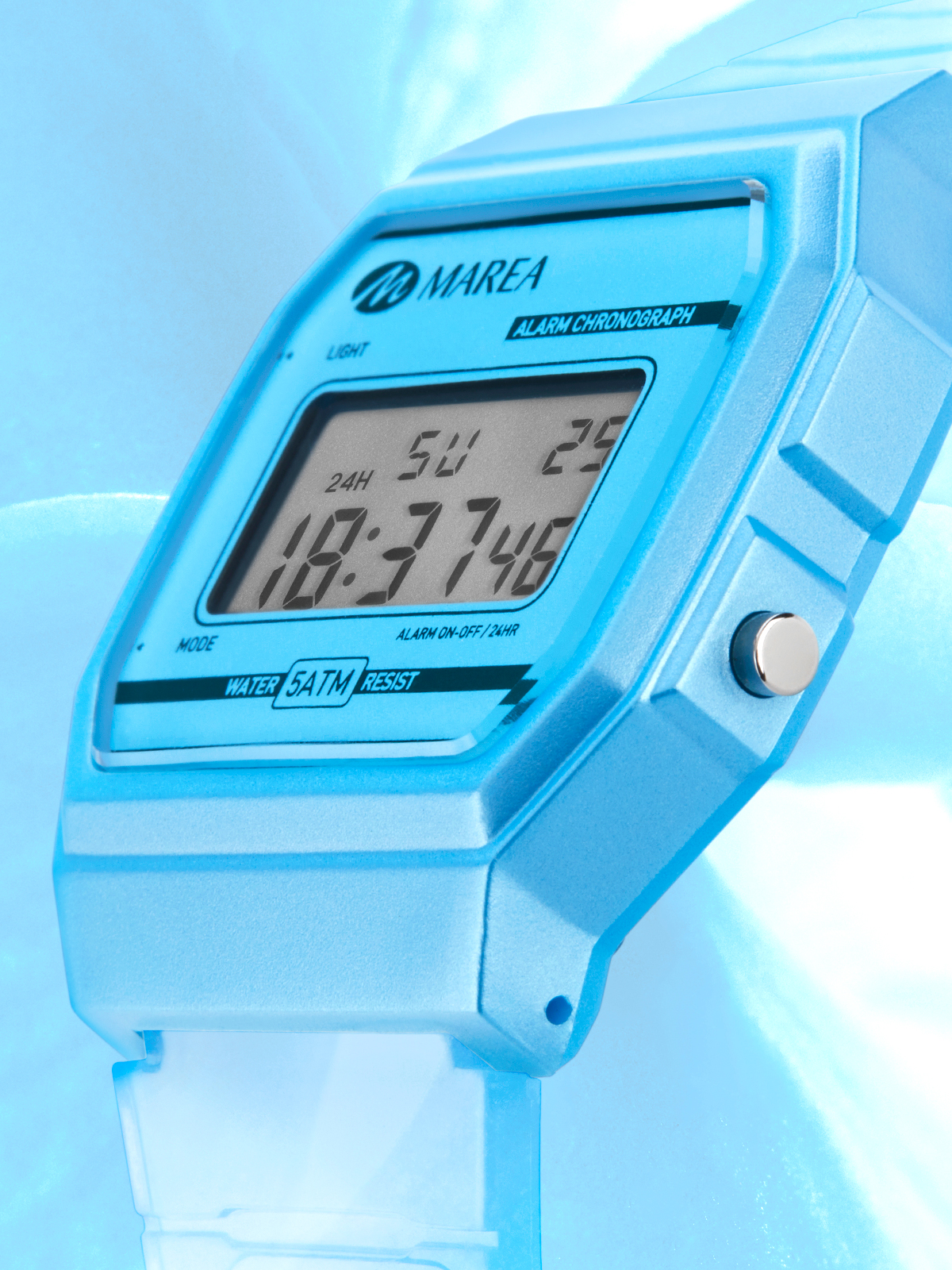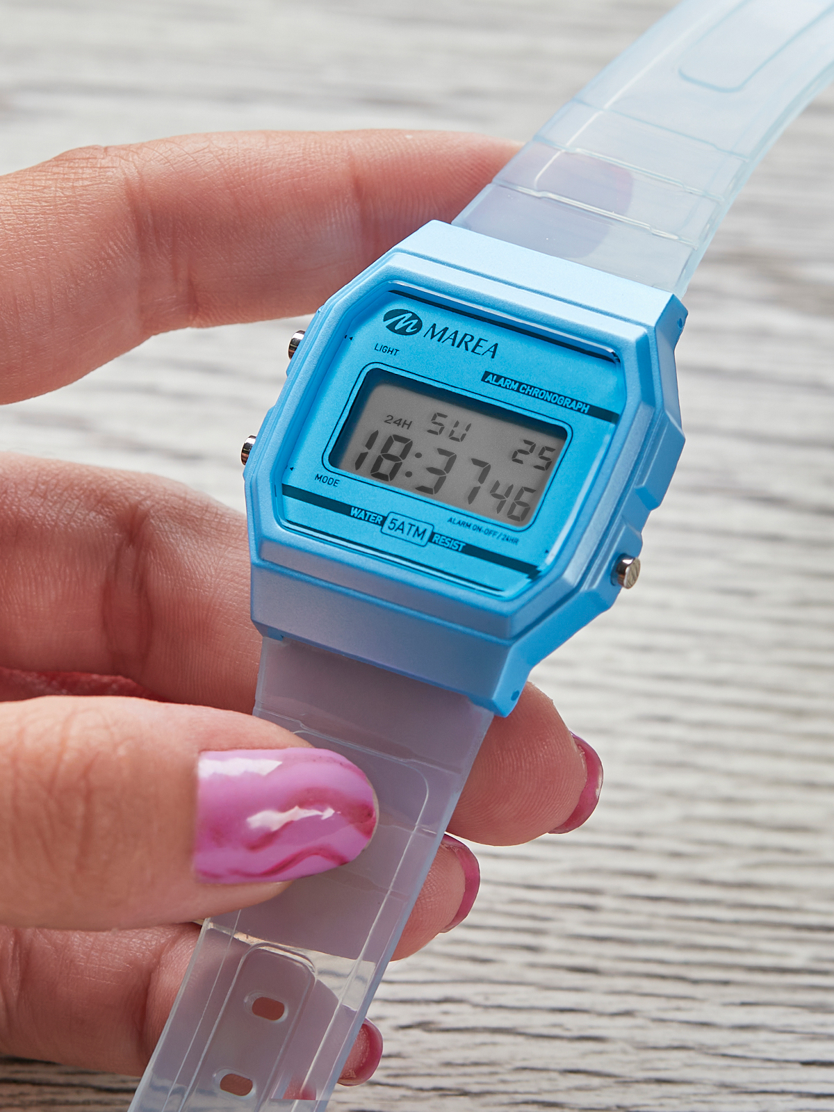 Movimiento japonés: pantalla LCD. Diámetro Caja: 33 x 38,5 mm. Material Caja: Plástico color azul claro. Material Brazalete: Plástico color azul claro transparente. Esfera: Color azul claro. Resistente al agua: 5 ATM