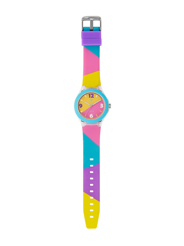 Material Brazalete: Silicona color rosa, amarillo, turquesa y morado.