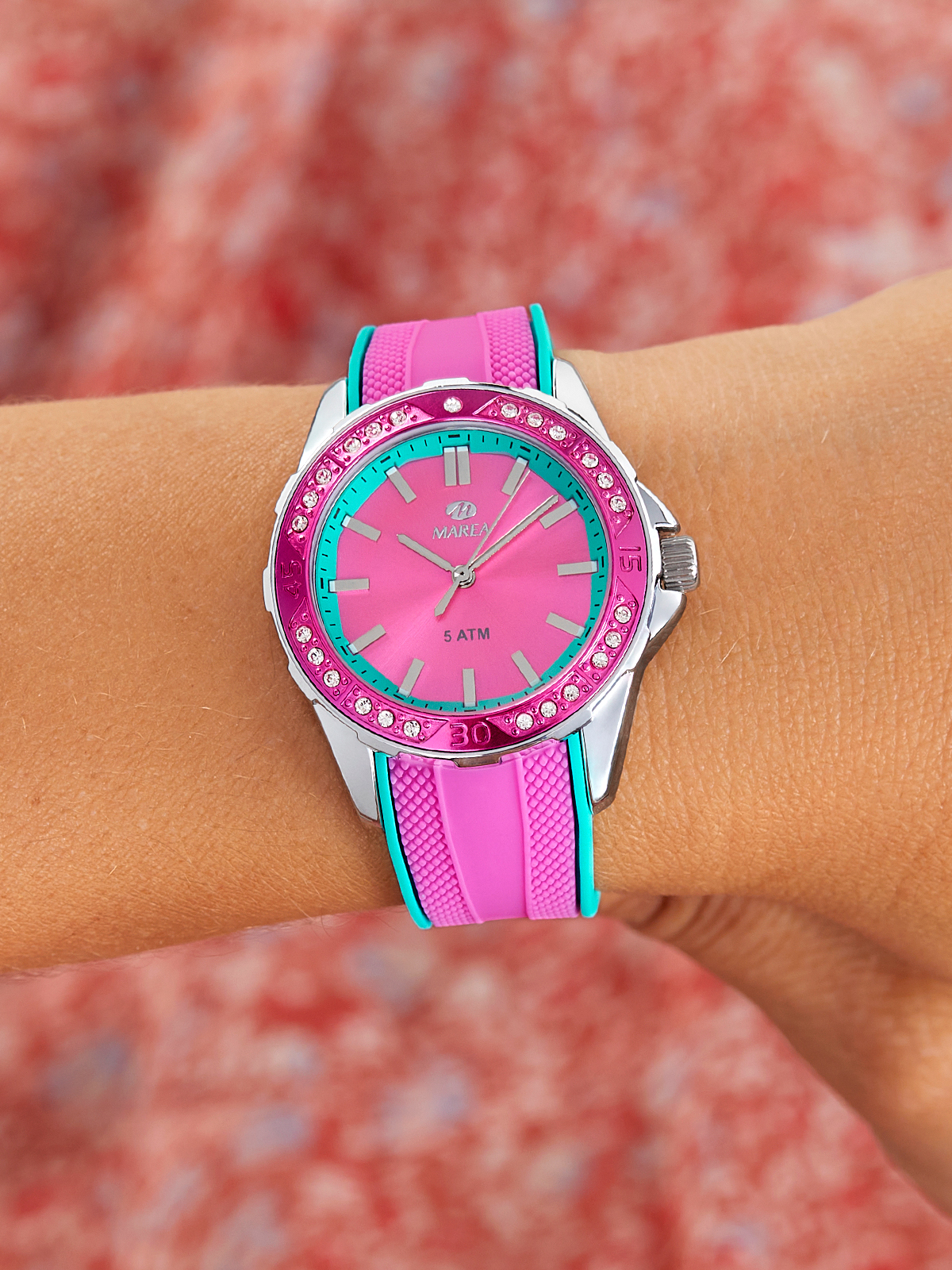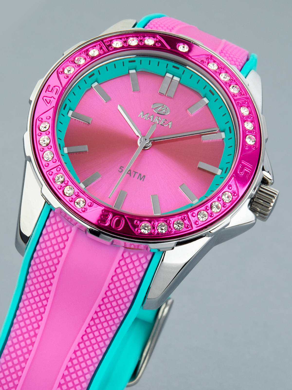 Material Brazalete: Caucho color fucsia y turquesa con hebilla de acero.