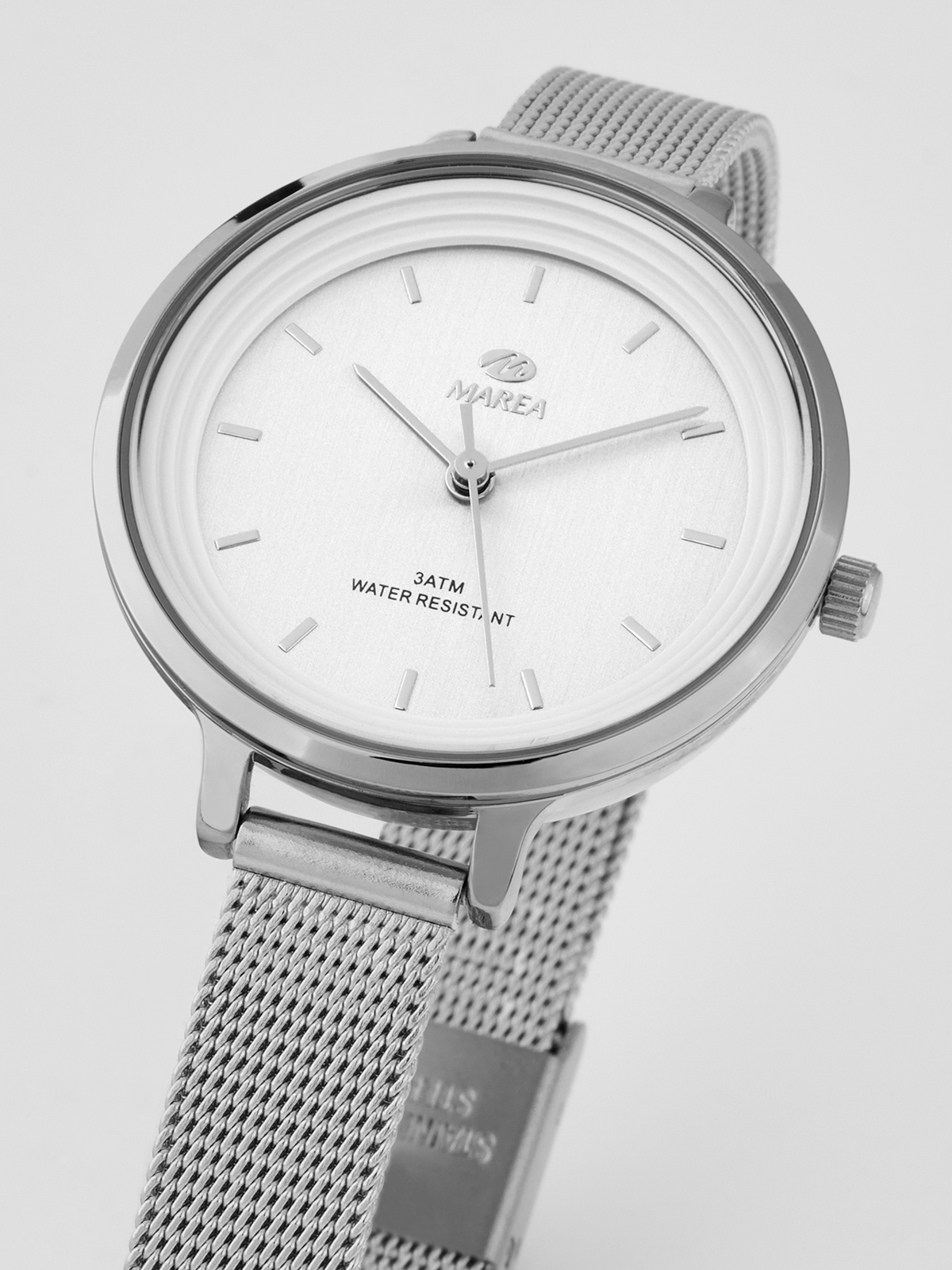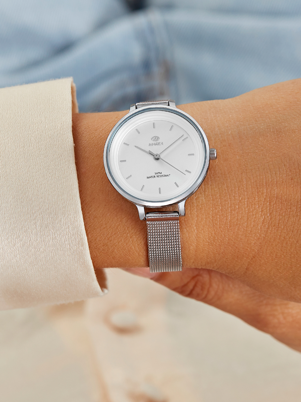Movimiento japonés: 3 agujas Diámetro Caja: 32 mm. Material Caja: Metal Material Brazalete: Acero Esfera: Color blanco Resistente al agua: 3 ATM