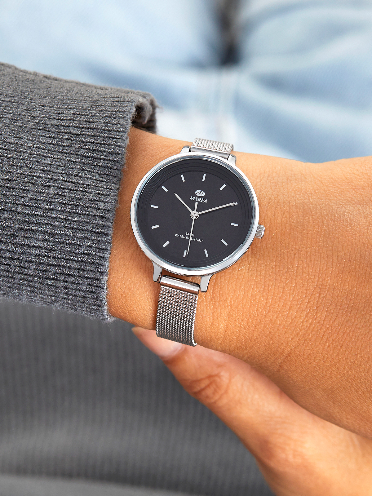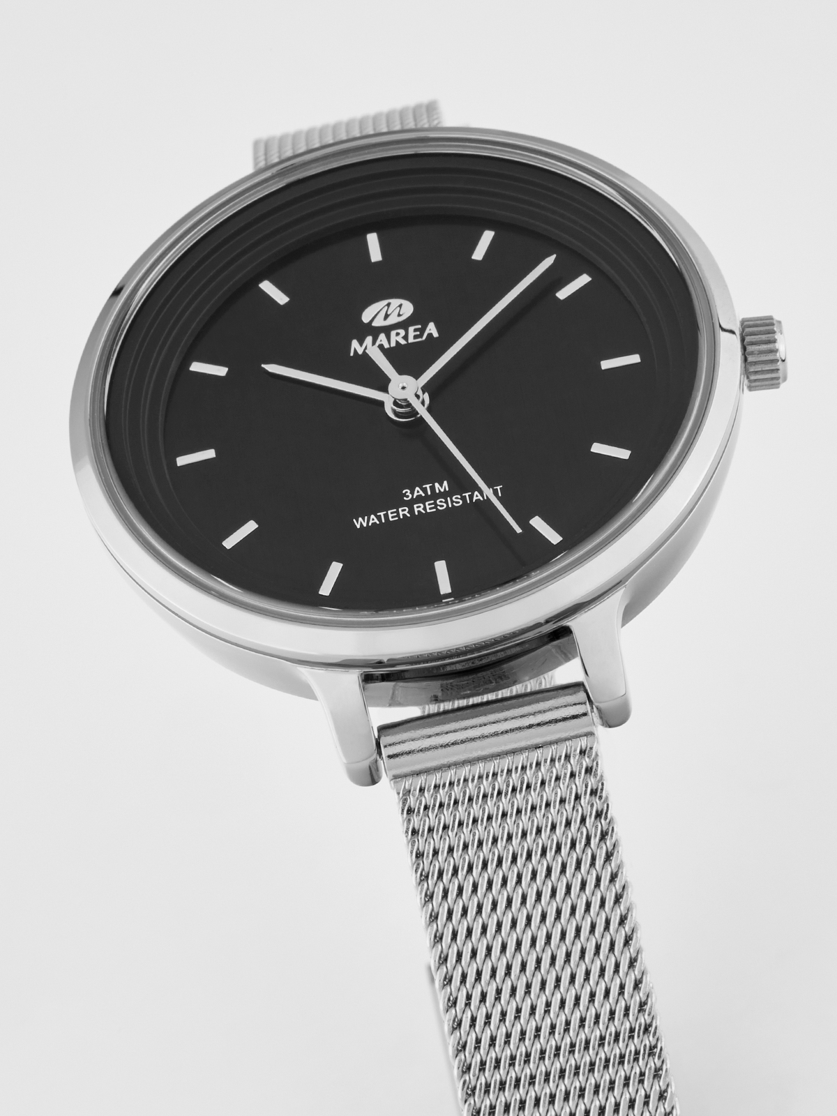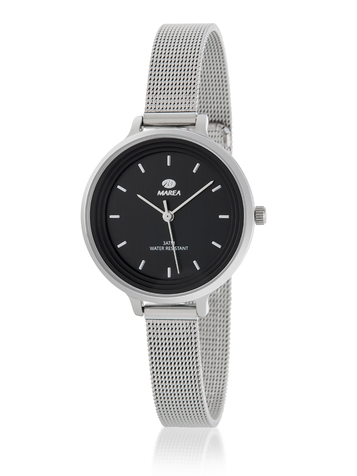 Movimiento japonés: 3 agujas Diámetro Caja: 32 mm. Material Caja: Metal Material Brazalete: Acero Esfera: Color negro. Resistente al agua: 3 ATM