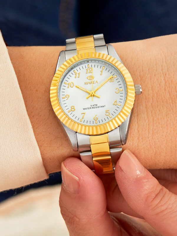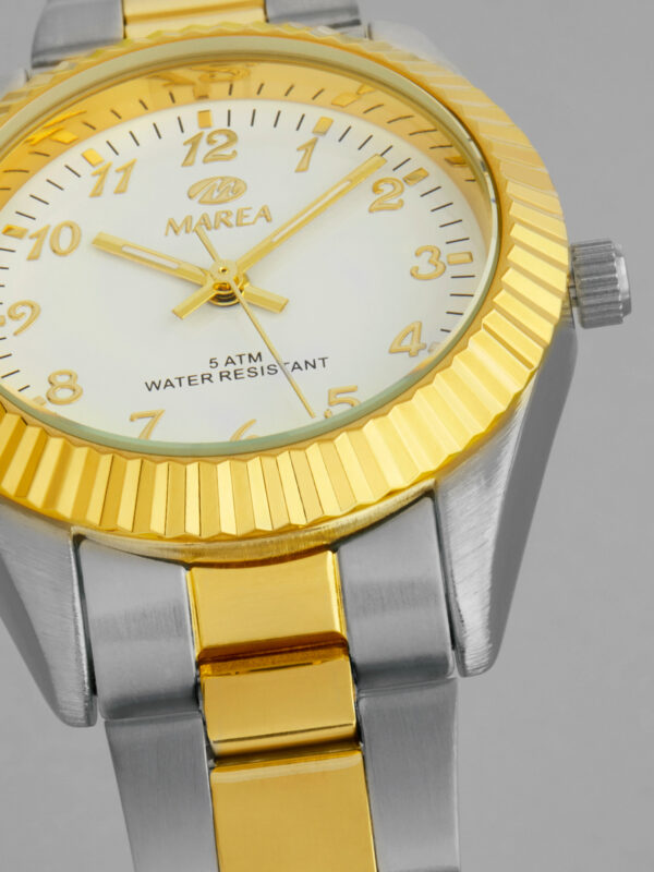 Movimiento japonés: 3 agujas Diámetro Caja: 32 mm. Material Caja: Metal Material Brazalete: Acero bicolor Esfera: Color blanco, detalles en gris Resistente al agua: 5 ATM