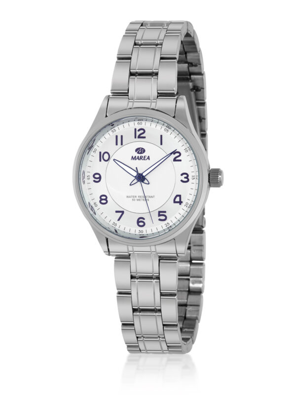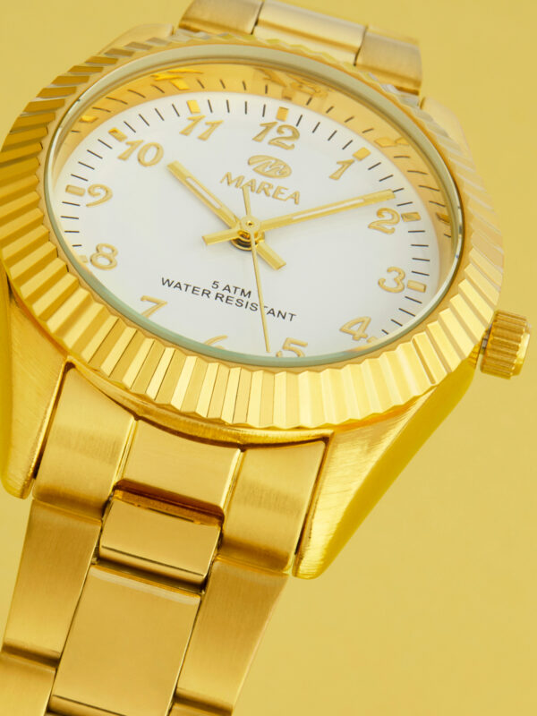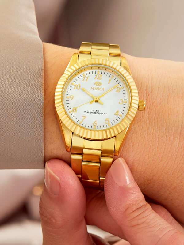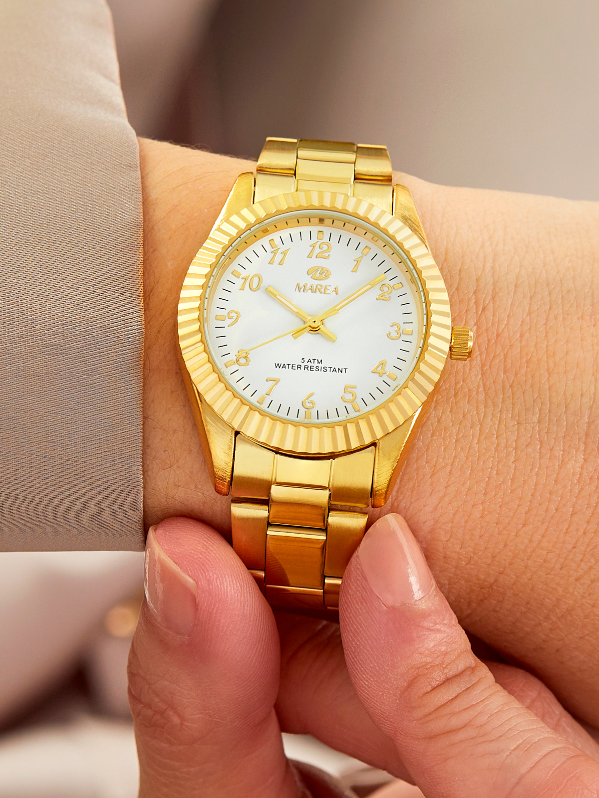 Movimiento japonés: 3 agujas Diámetro Caja: 32 mm. Material Caja: Metal Material Brazalete: Acero en color dorado Esfera: Color blanco, detalles en dorado Resistente al agua: 5 ATM