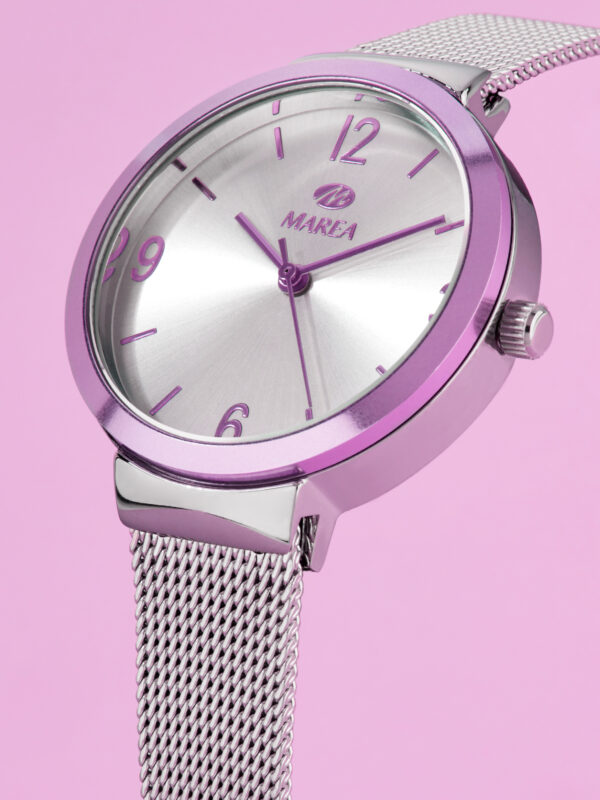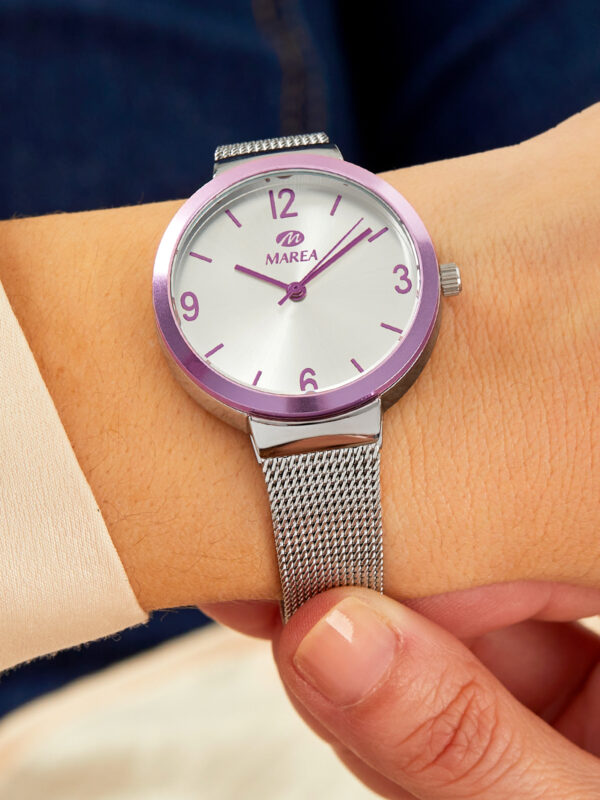 Movimiento japonés: 3 agujas. Diámetro Caja: 34 mm. Material Caja: Metal con bisel en color lila claro. Material Brazalete: Acero. Esfera: Color plateado con agujas e índices en color lila claro. Resistente al agua: 3 ATM