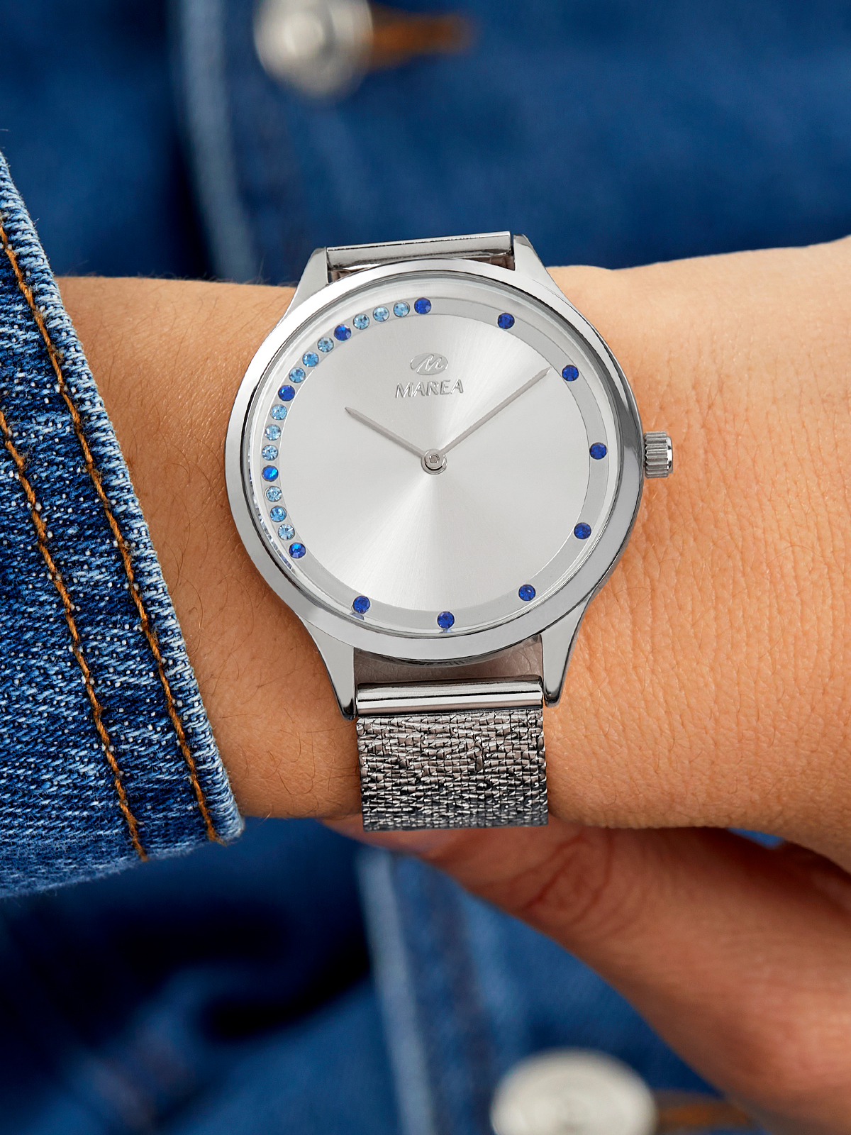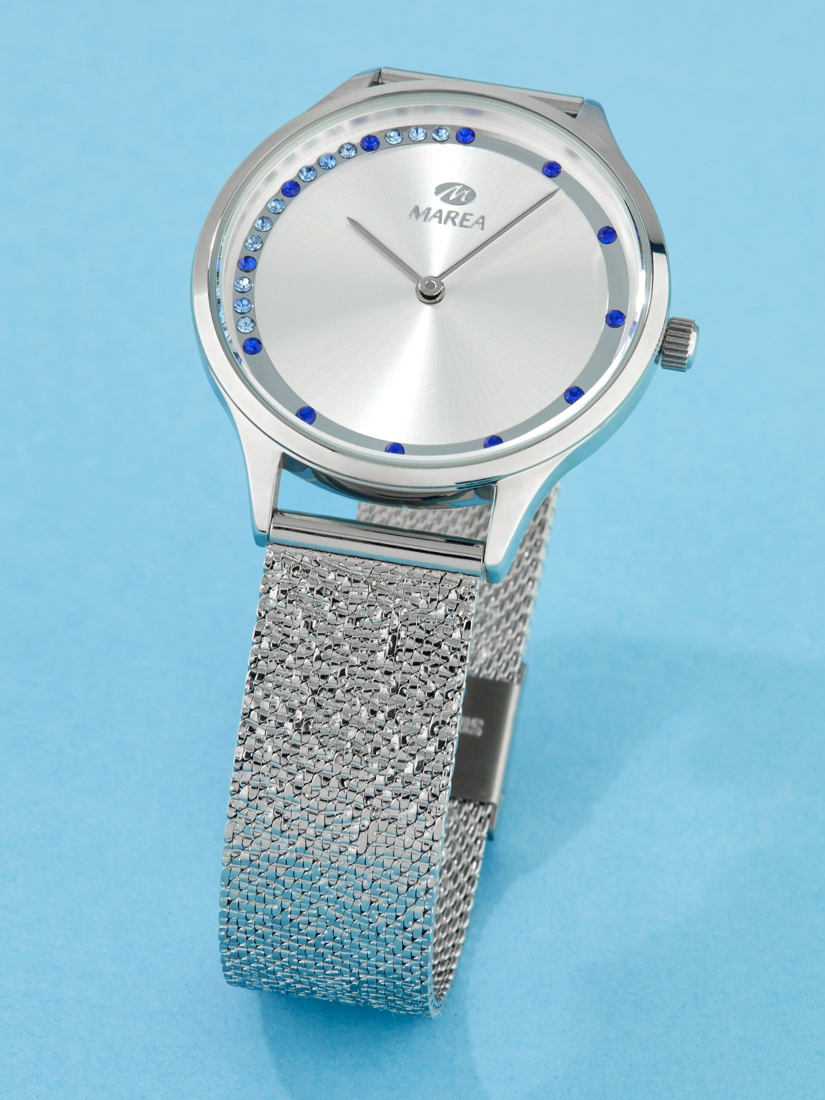 Movimiento japonés: 2 agujas. Diámetro Caja: 36 mm. Material Caja: Metal. Material Brazalete: Acero. Esfera: Color plateado con piedras azules. Resistente al agua: 3 ATM
