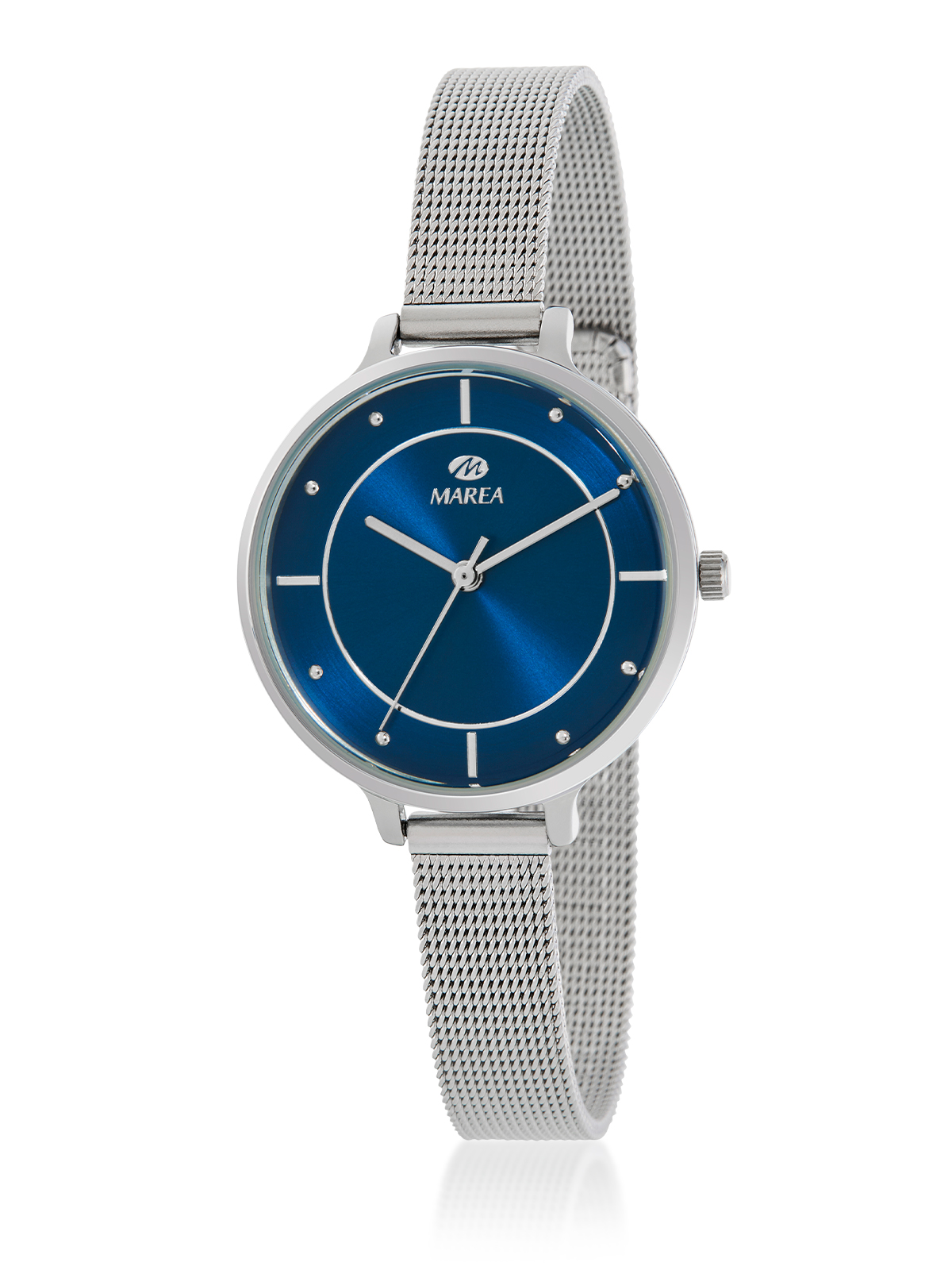 Movimiento japonés: 3 agujas Diámetro Caja: 32 mm. Material Caja: Metal. Material Brazalete: Acero. Esfera: Color azul marino. Resistente al agua: 3 ATM